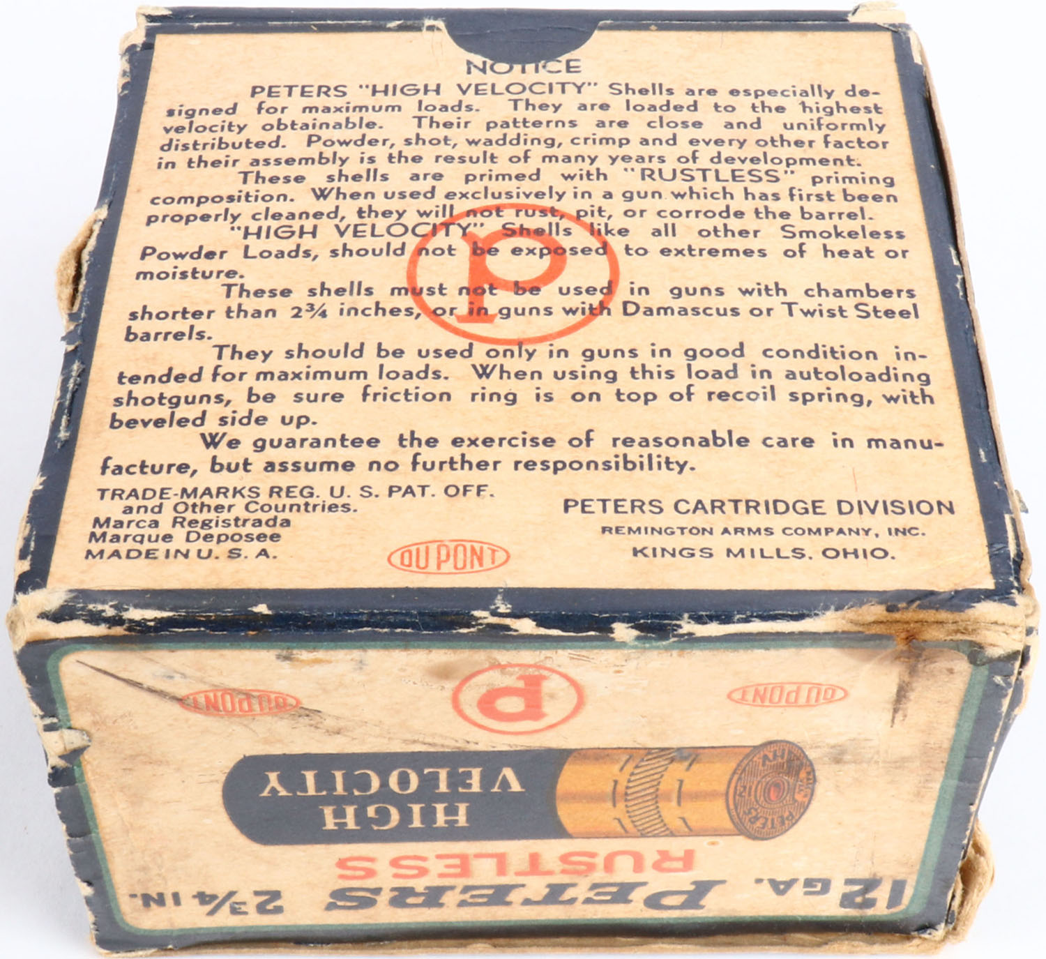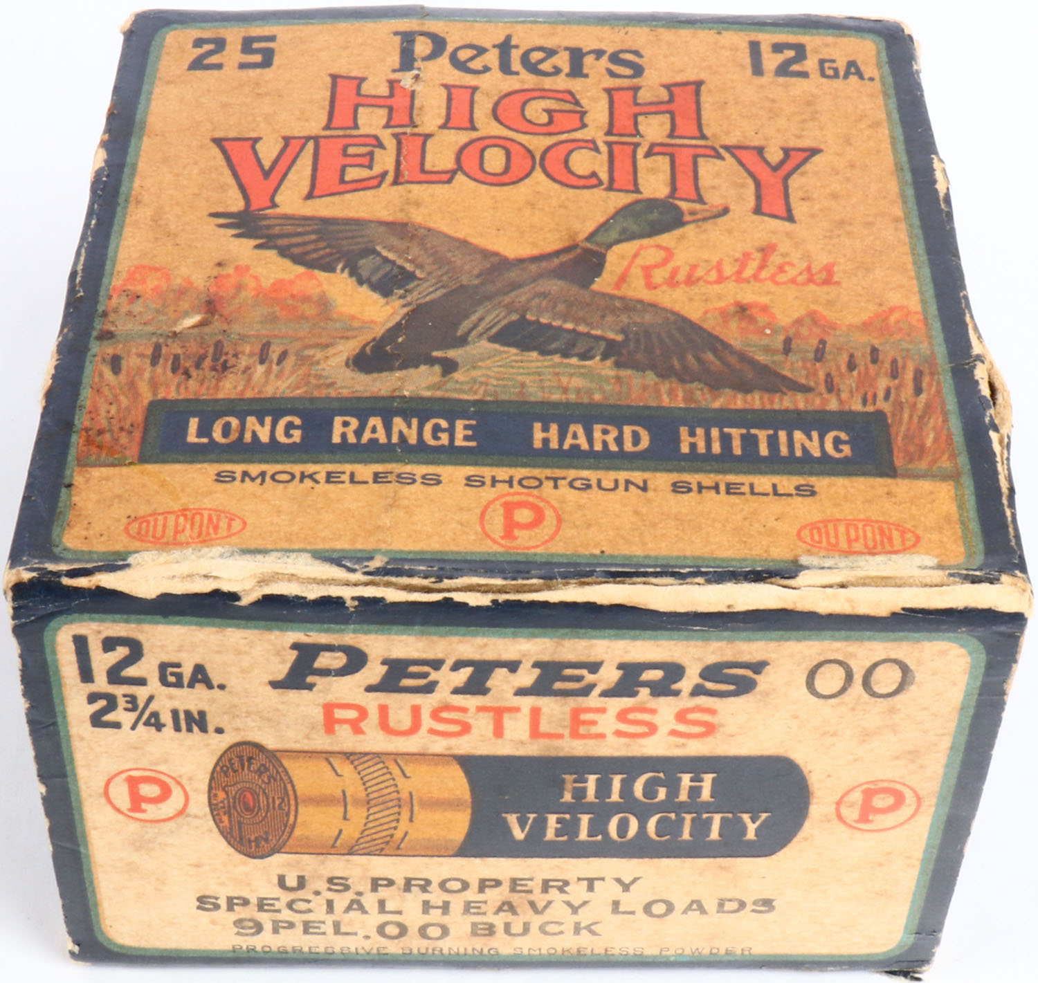Peters Cart. Co., Kings Mills, OH, U.S PROPERTY High Velocity, 12ga., 1pc., Full, shot size 00 Buck Special Heavy Loads, multi colored box that pictures mallard flying out of the marsh grass, box is solid has age soiling, light edge wear, small shell protrusions, and a tear on box, shells are very good. Grade: Very Good - Value: 20 to 60