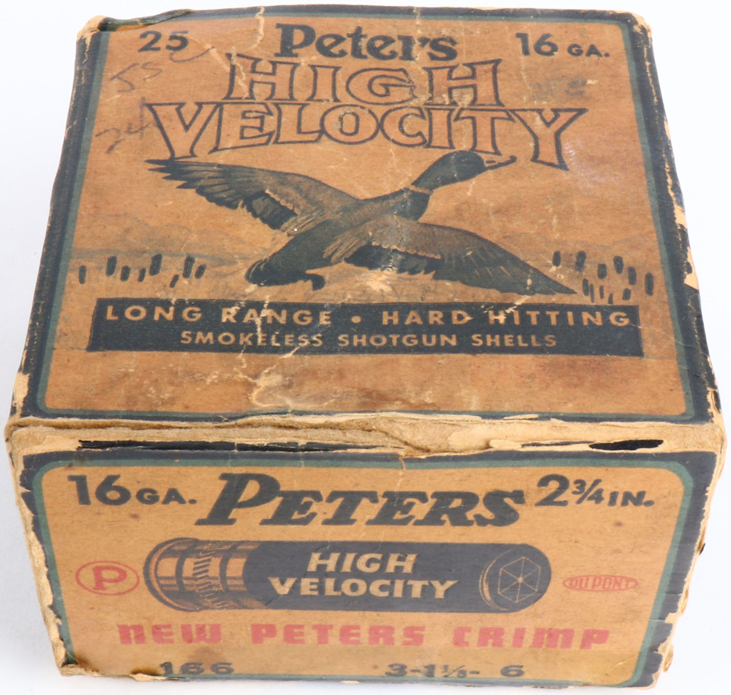 Peters Cart. Co., Bridgeport, CT, High Velocity, 16ga., 2 3/4'', 1pc., Empty, shot size 6, multi colored box that pictures mallard flying out of the marsh grass, box has age soiling, edge wear, scuffing & bottom flap is torn. Grade: Good + - Value: 10 to 60