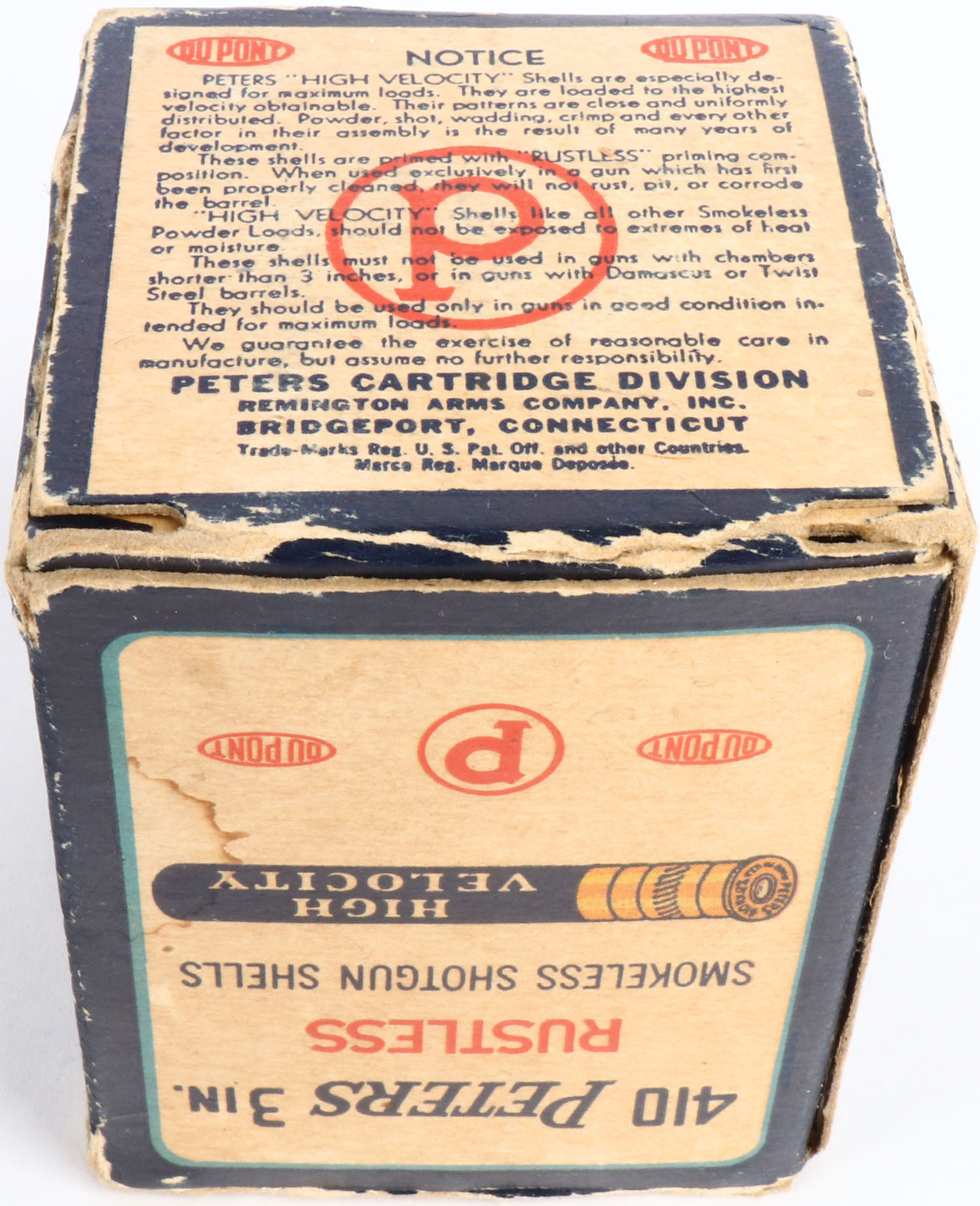 rare Peters, High Velocity, 410ga., 3'', 1pc., Full with only 11rds being correct shot size, shot size 6 CH, multi-colored box with mallard duck flying out of marsh grass, box has great colors with edge wear, Shells are excellent. Grade: Excellent - Value: 40 to 100