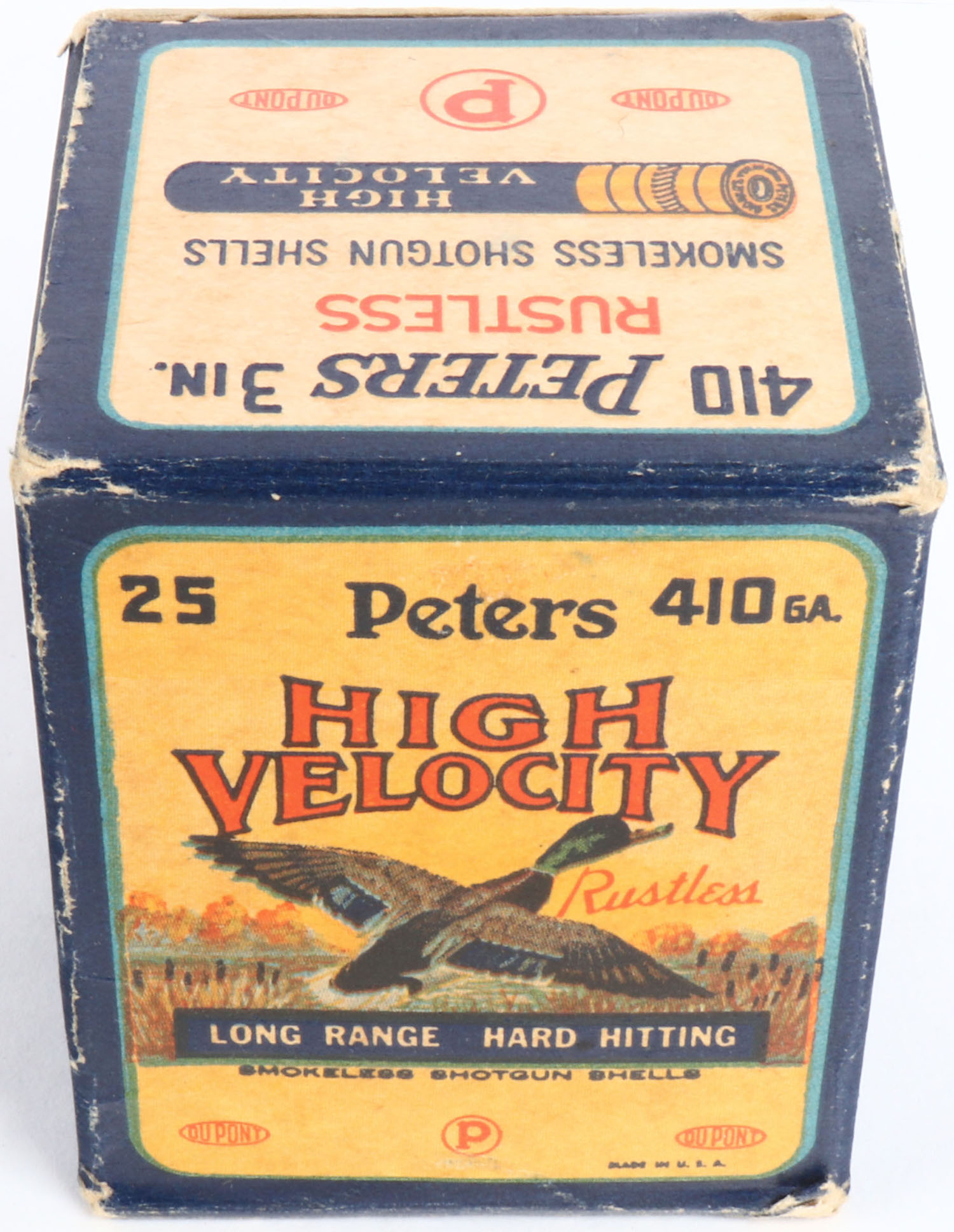 Peters, High Velocity, 410ga., 3'', 1pc., Full of mostly 6 shot and other mixed shot sizes., shot size Skeet Load, multi-colored box with mallard duck flying out of marsh grass, box has great colors with light edge wear, Shells are excellent. Grade: Excellent + - Value: 40 to 100