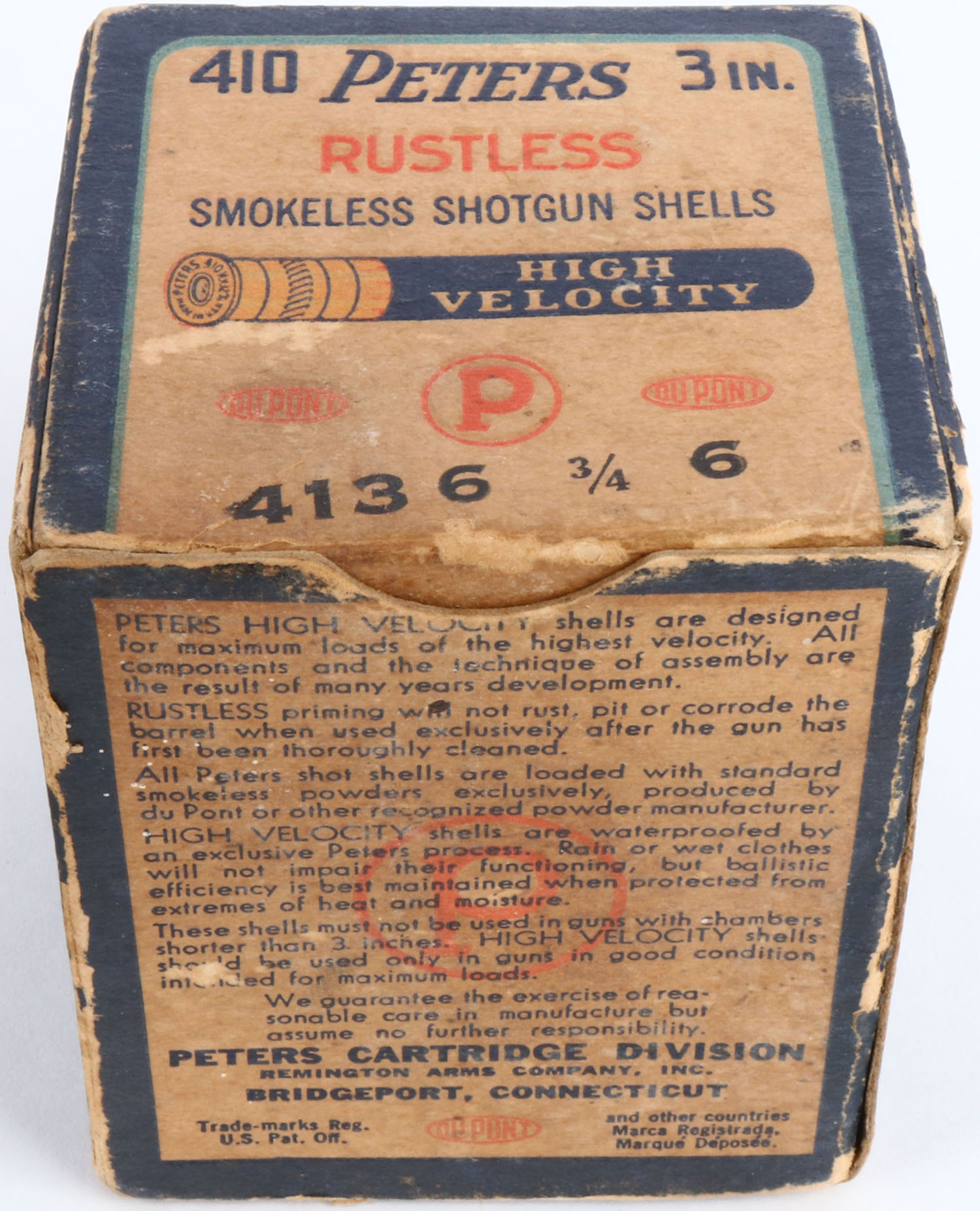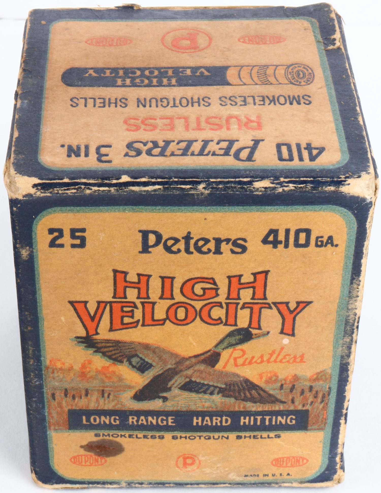 Peters, High Velocity, 410ga., 3'', 1pc., Empty, shot size 6, multi-colored box with mallard duck flying out of marsh grass, box has great colors with edge wear, age soiling & top flap is torn. Grade: Very Good + - Value: 20 to 60