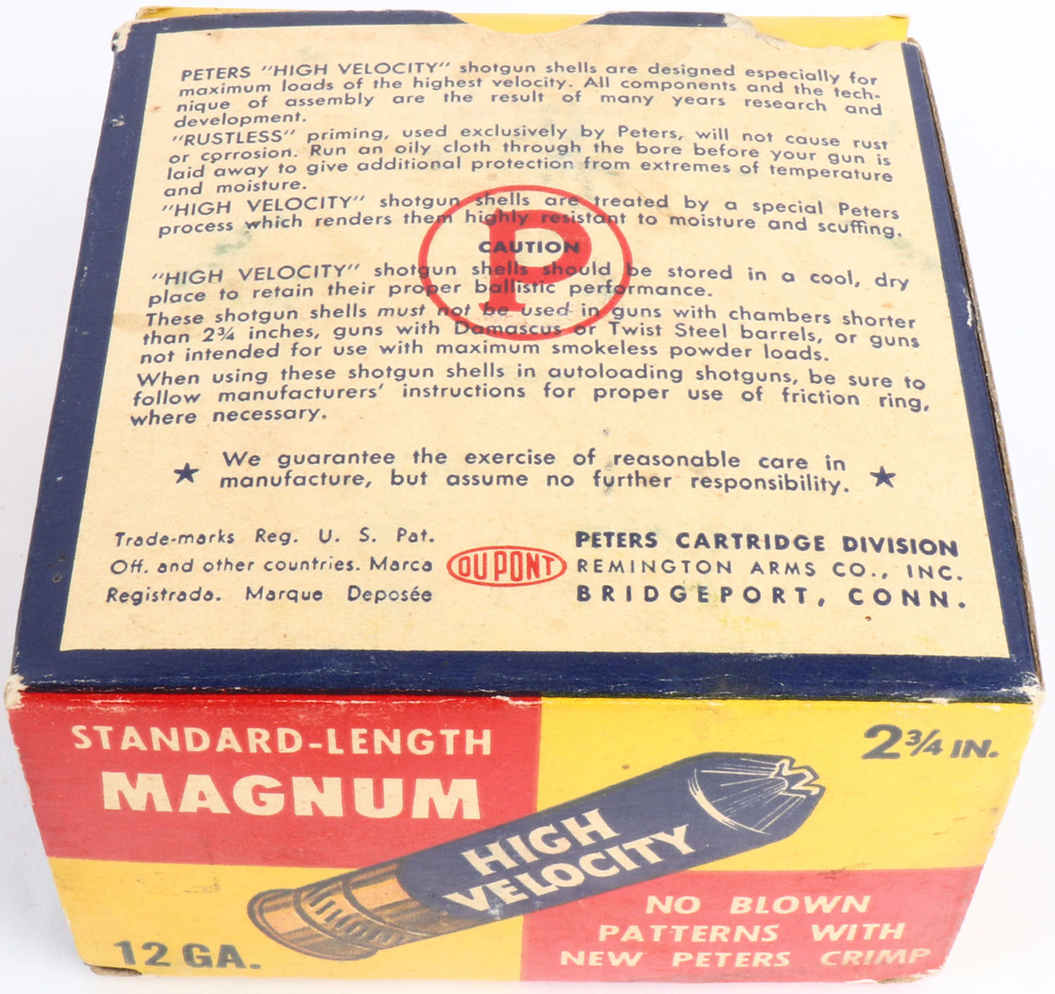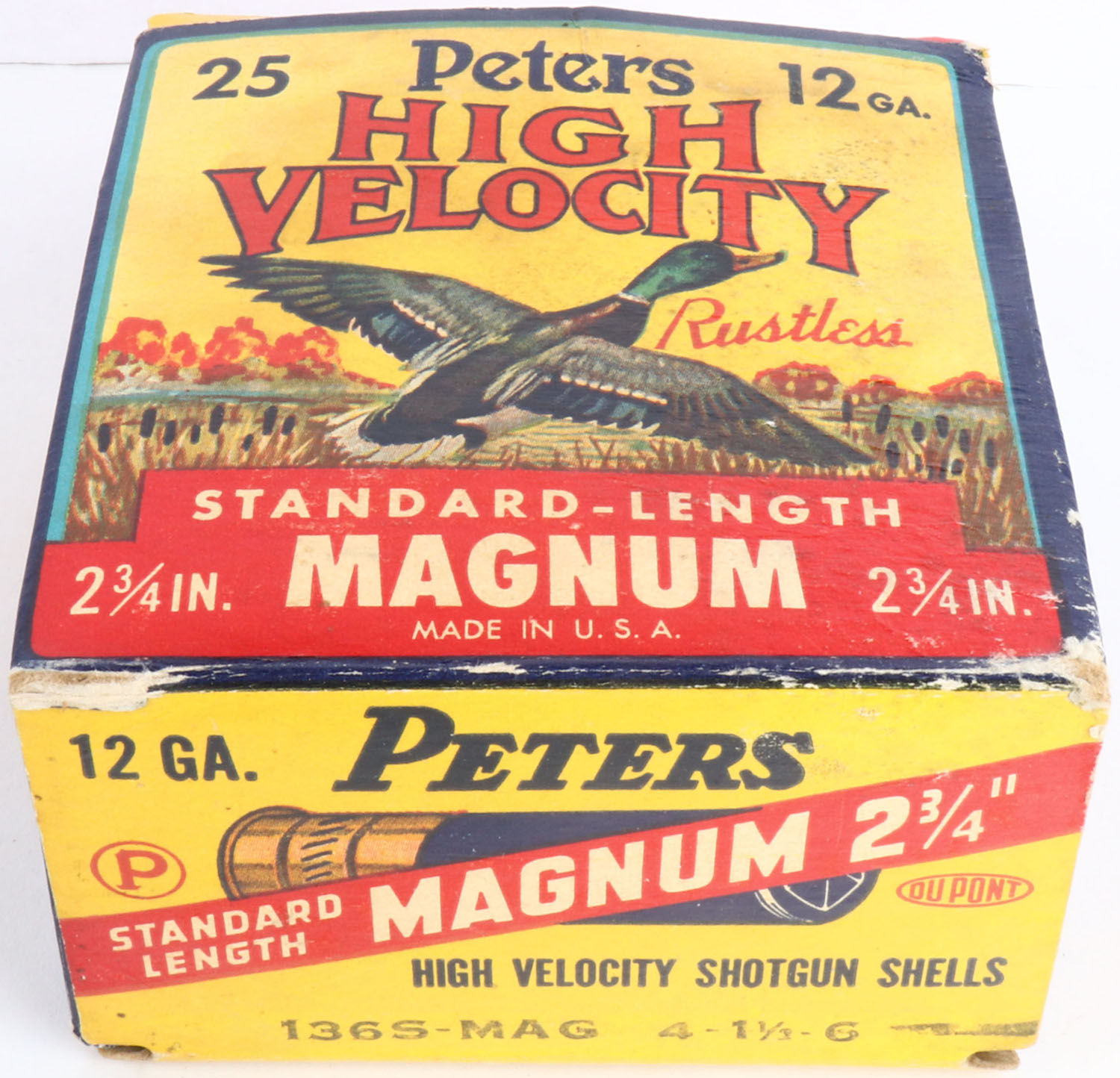 Peters Cart. Co., Magnum, High Velocity, New Peters Crimp, 12ga., 1pc., Full, shot size 6 Magnum, multi colored box that pictures mallard flying out of the marsh grass, box is solid with light edge wear, light soiling, & small tear, Shells are excellent. Grade: Excellent - Value: 20 to 100