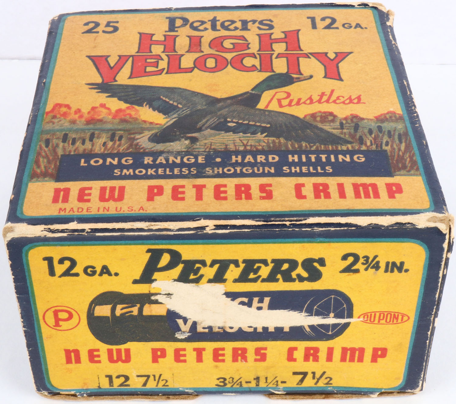 Peters Cart. Co., High Velocity, New Peters Crimp, 12ga., 1pc., Empty, shot size 7 1/2, multi colored box that pictures mallard flying out of the marsh grass, box is solid with edge wear, scuffing & light age soiling. Grade: Very Good ++ - Value: 10 to 60