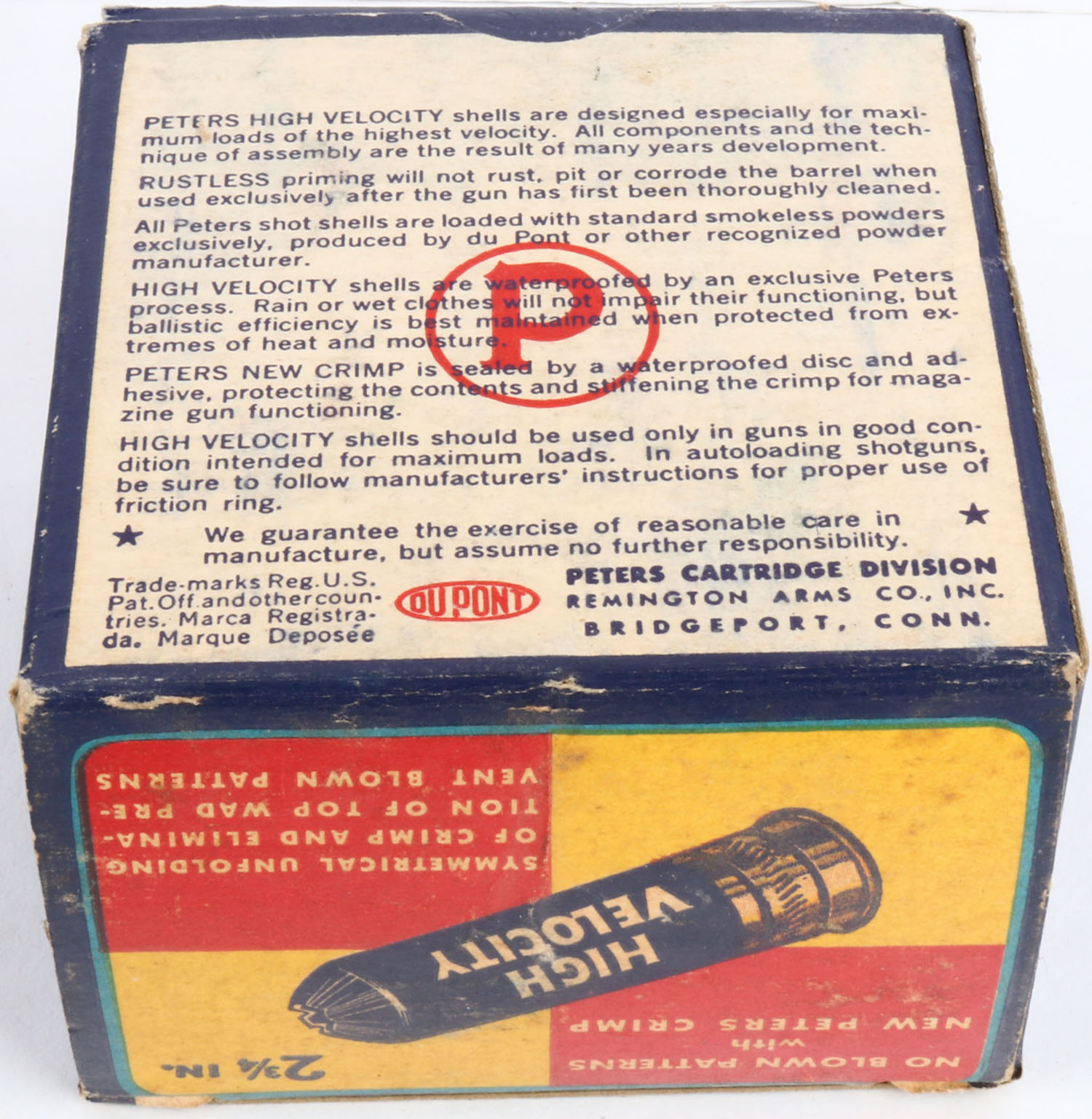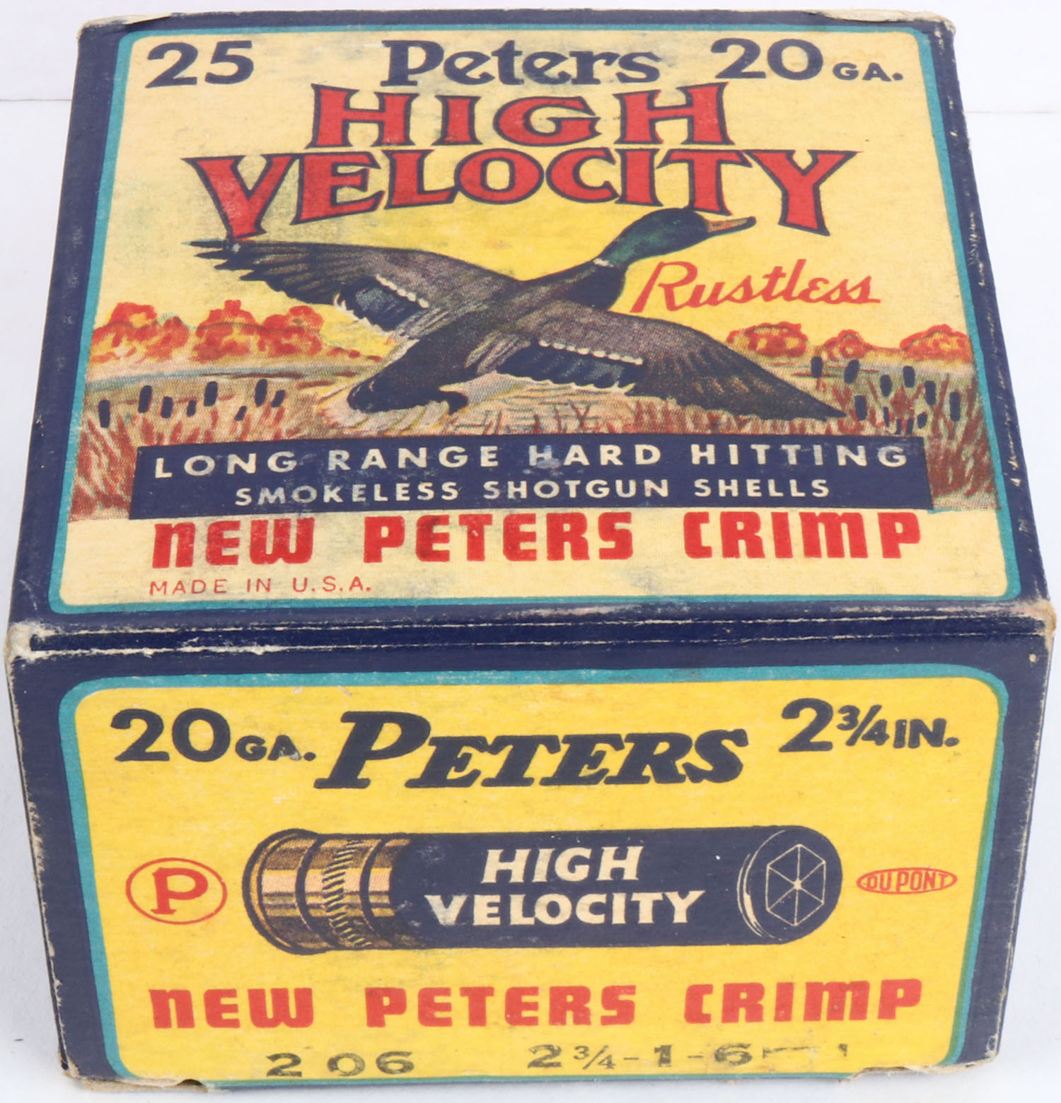Peters Cart. Co., High Velocity, New Peters Crimp, 20ga., 1pc., Partial 16rds, shot size 6, multi colored box that pictures mallard flying out of the marsh grass, box very solid with great colors, has light age soiling, shells are excellent. Grade: Excellent - Value: 20 to 50