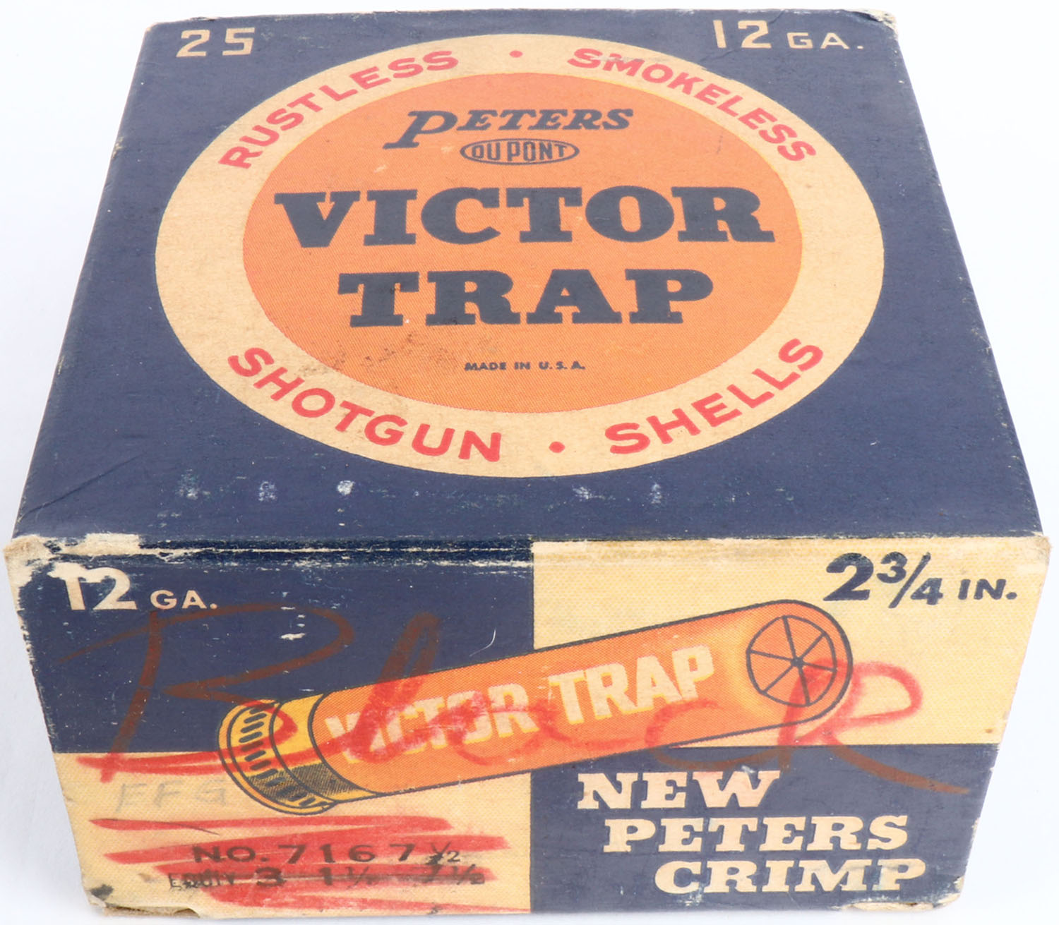 Peters, VICTOR TRAP, 12ga., 1pc., Partial 18rds, might possibly be reloads, shot size 7 1/2, blue, white & orange box, box has very nice color with soiling, shells are very good. Grade: Very Good ++ - Value: 10 to 40