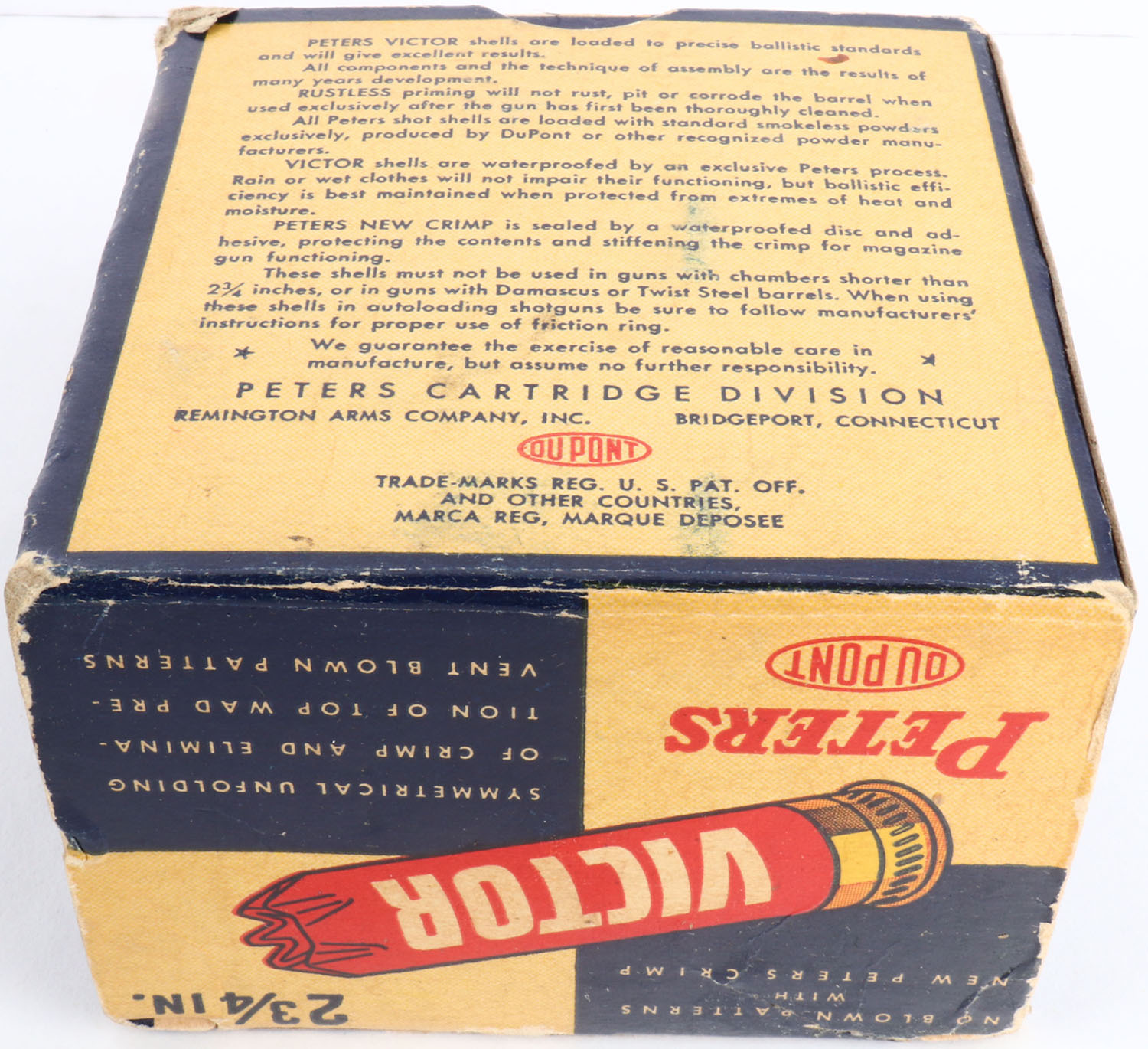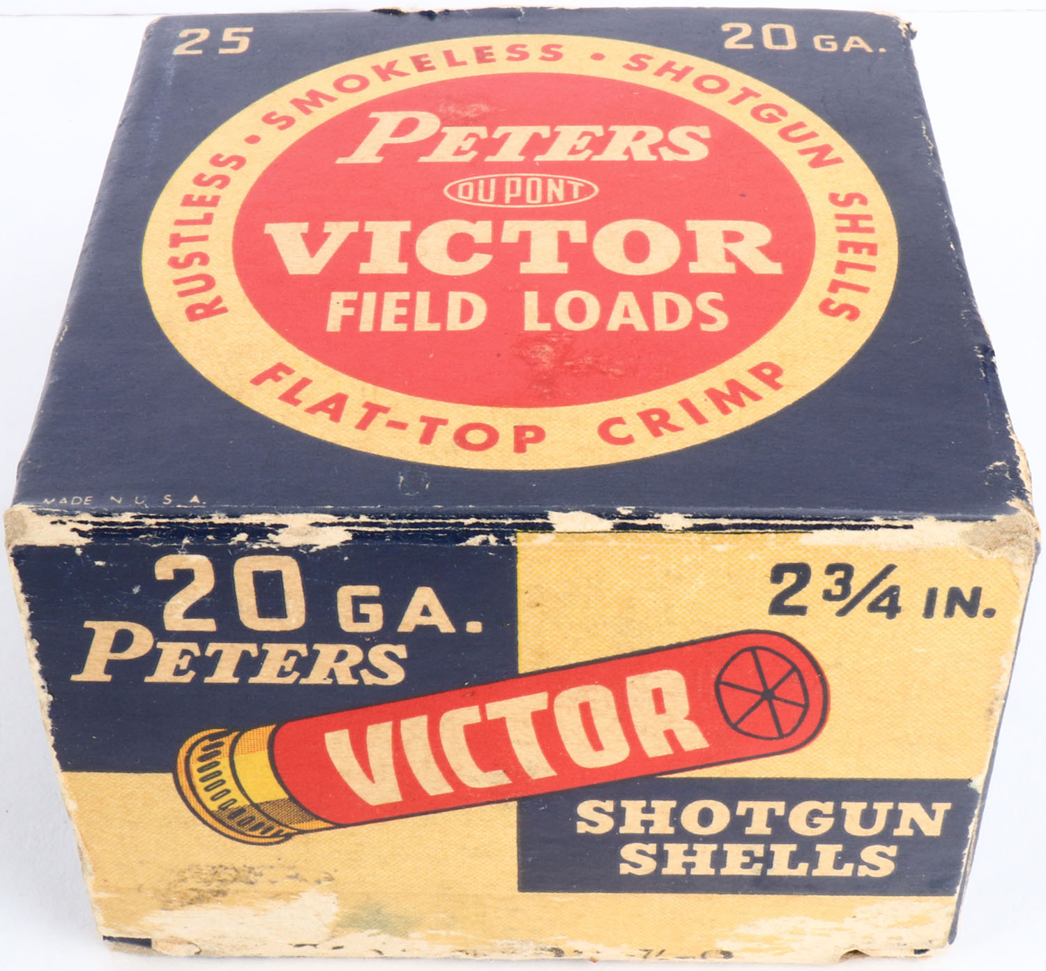 Peters, VICTOR Field Loads, 20ga., 1pc., Full with 2rds being incorrect shot size, shot size 8, blue, white & red box, box has great color with light edge wear & light scuffing, shells are excellent. Grade: Excellent - Value: 10 to 40