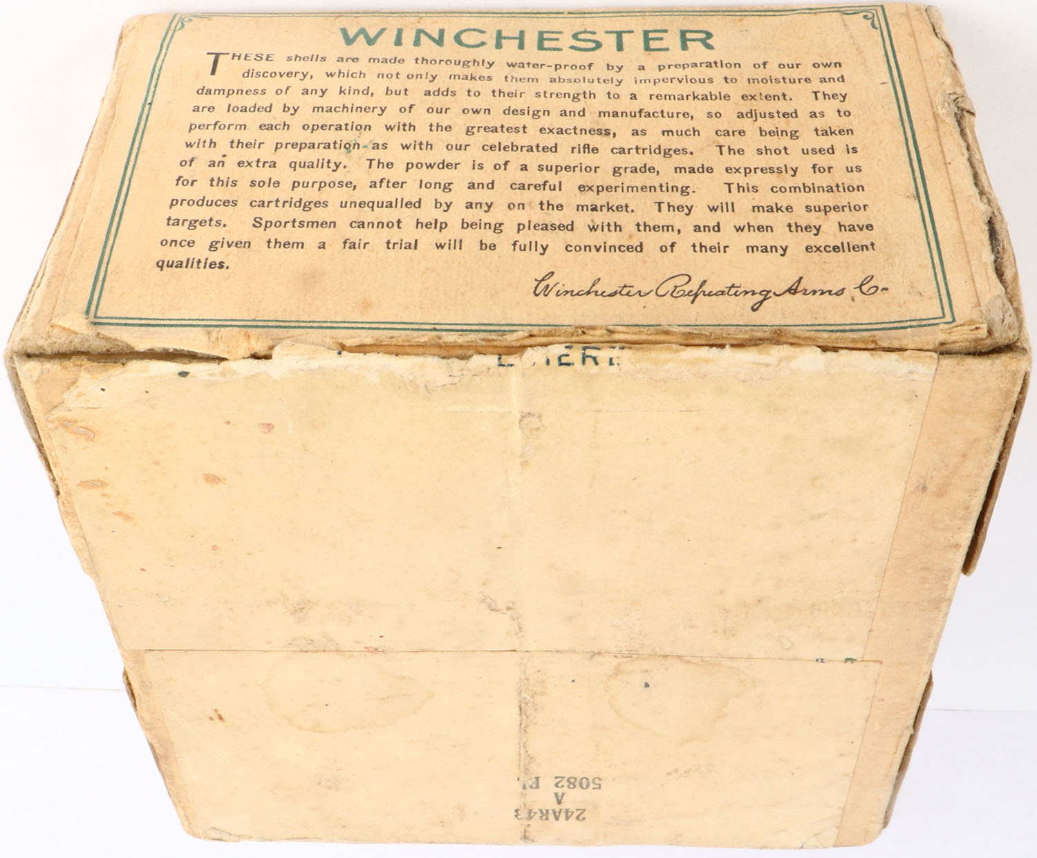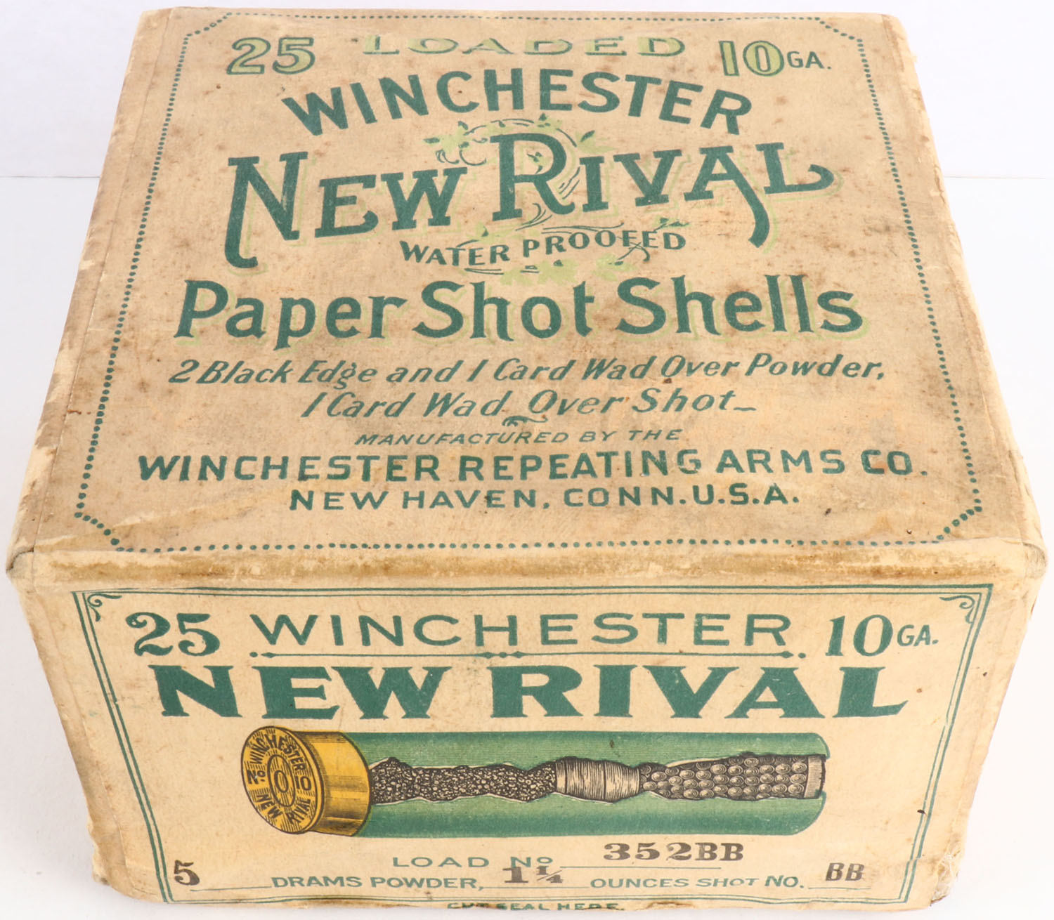 Winchester, New Rival, 10 Gauge, 2pc., Empty., Shot Size BB, Buff box with buff & green label, box has glue repair, light soiling & light edge wear with very nice label. Grade: Excellent - Value: 200 to 600