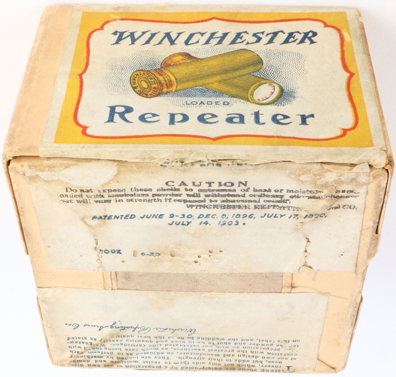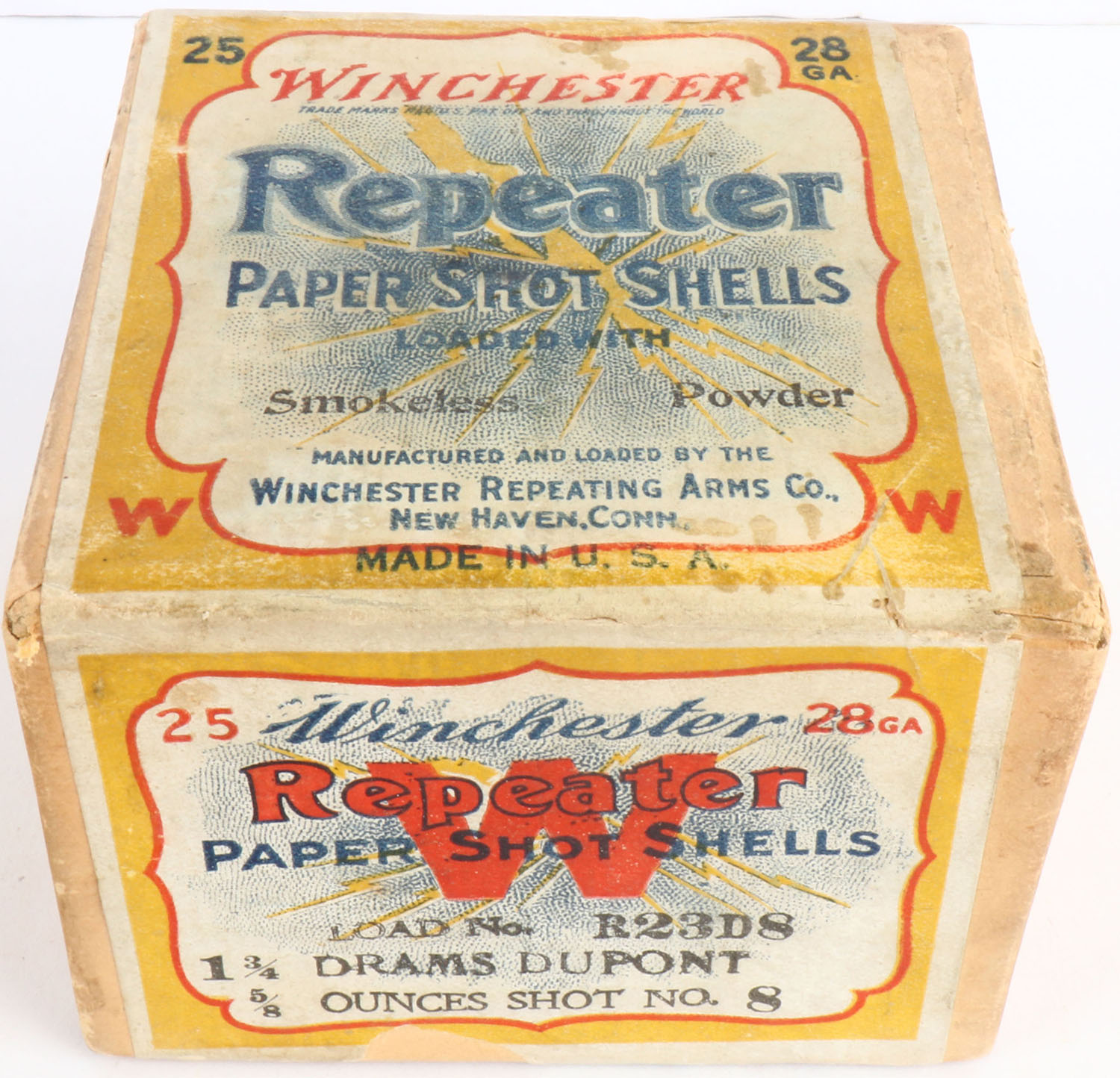 Winchester, REPEATER, 28 Gauge, 2pc., FULL, Shot Size 8, Buff box with yellow, white & red label showing lightning bolt, box is very solid with nice label, seam split on bottom of box, and light age soiling. Shells are excellent. Grade: Excellent + - Value: 200 to 800