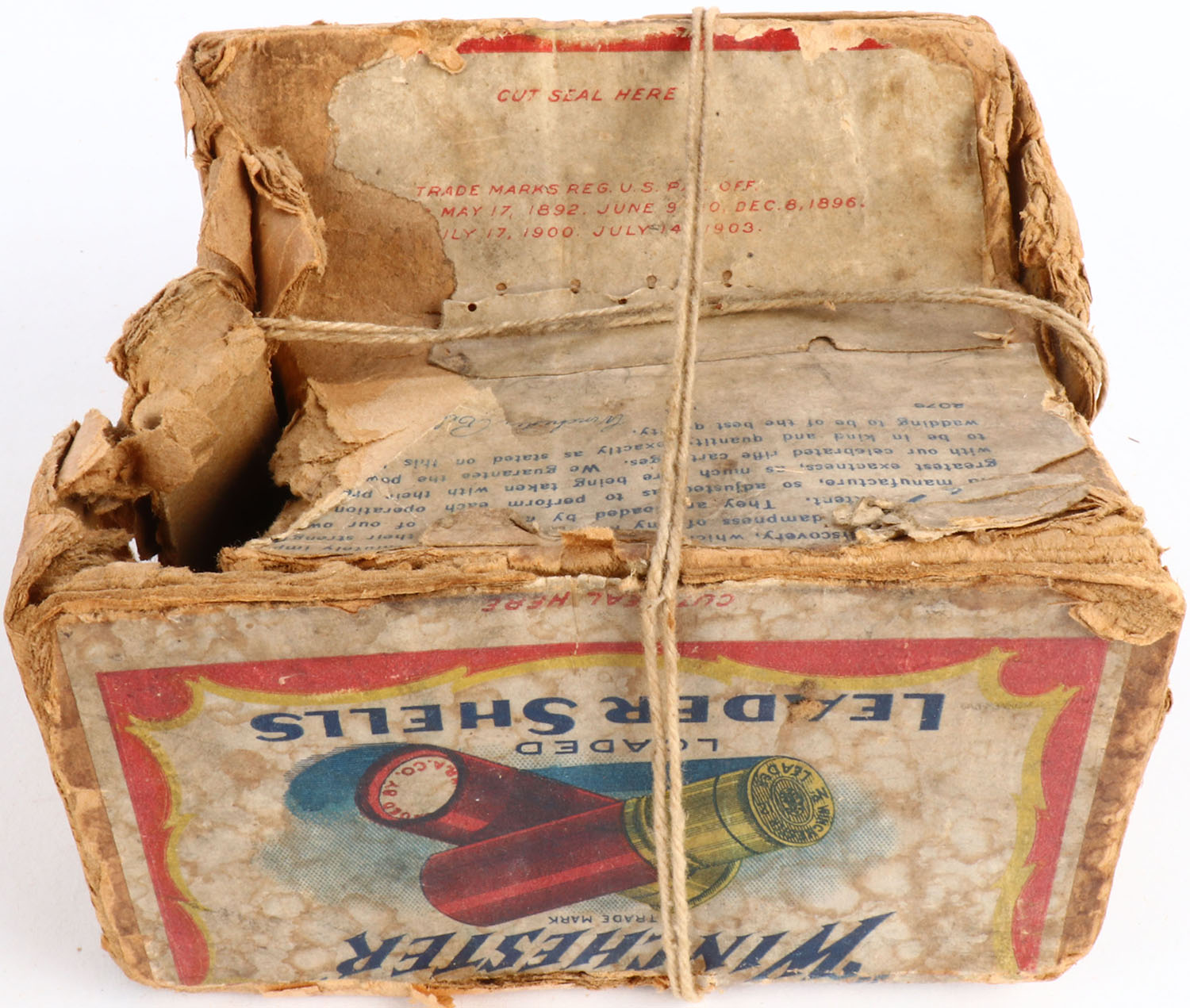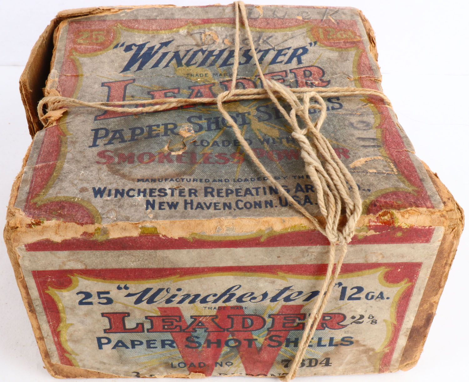 Winchester, LEADER, 12ga, 2pc., Empty, shot size Unknown, Buff box with red, yellow, white & black label showing lightning bolt, box has edge wear, seam splits, scuffing & tears with nice color to label. Grade: Good + - Value: 2 to 60