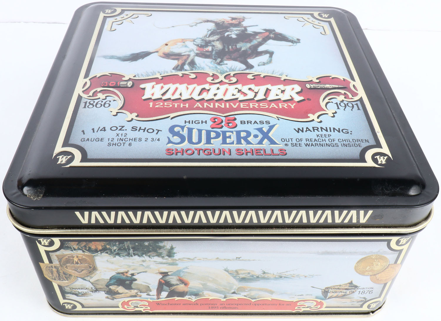 Winchester, Super-X 125th ANNIVERSARY, 1866-1991, 12ga., 2pc., FULL, 25 count metal tin. Grade: MINT - Value: 20 to 60