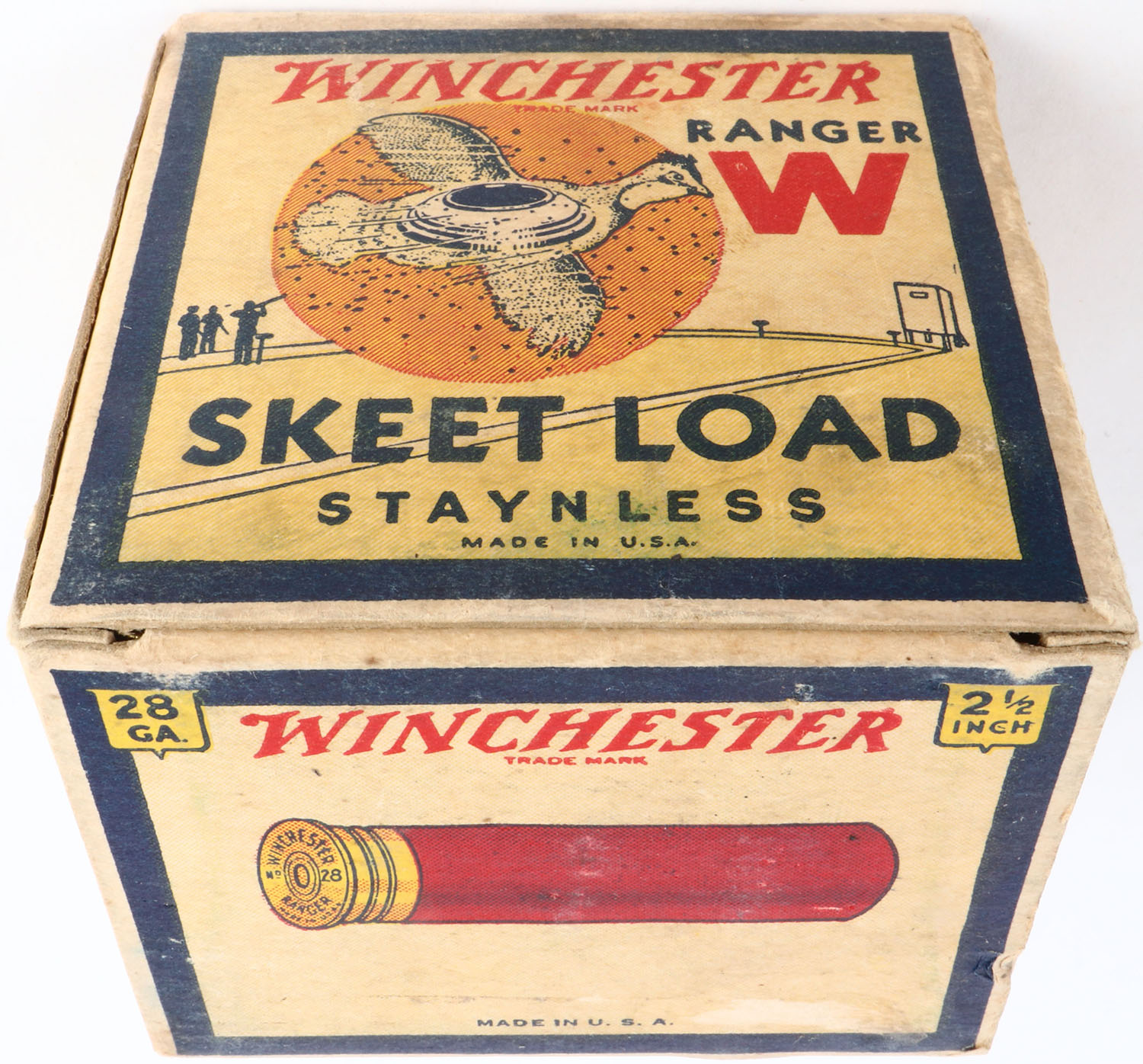 Winchester, RANGER SKEET LOAD, 28ga, 1pc., Full, White, black & red box that pictures flying Quail with skeet in body & shot all around, Western Minimax Staynless, 2 1/2'', Loading: 1 3/4 Drams 5/8 Oz. 9 Chilled Shot, Box is very solid with light soiling, light scuffing & excellent colors, Shells are good. RARE BOX. Grade: Very Good ++ - Value: 200 to 600