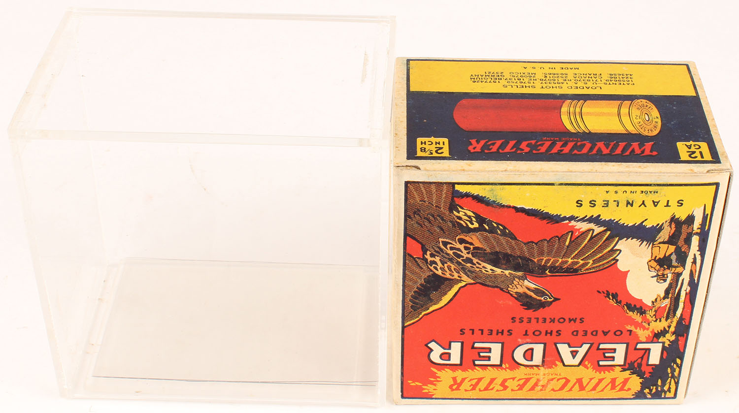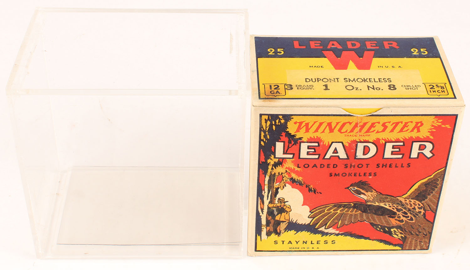 Winchester, LEADER QUAIL BOX, with Acrylic box, NEAR MINT, 12ga., 1pc., Full, shot size 8 Chilled, multi colored box with flying Quail & hunter in background, Staynless, 2 5/8'', Loading: 3 Drams 1 Oz. No. 8 Chilled Shot, box is very solid with really light soiling, has amazing colors, Shells are excellent. Grade: Excellent +++ - Value: 500 to 1200