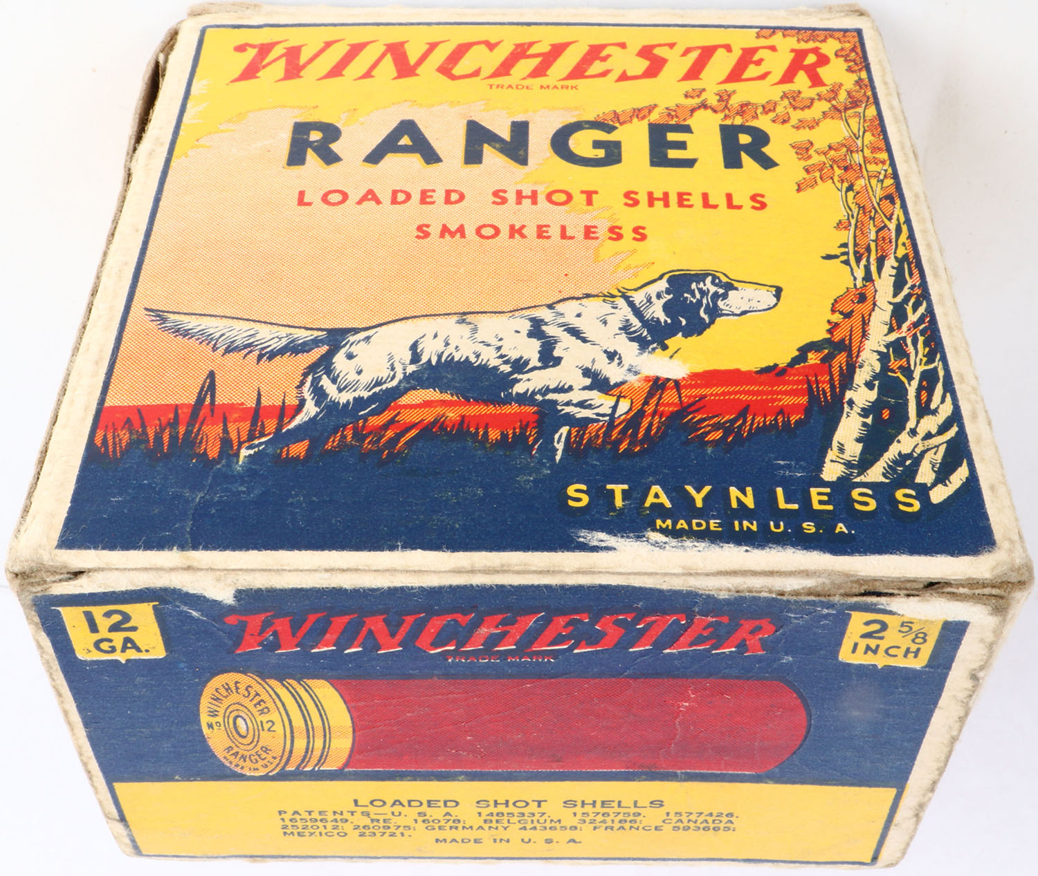 Winchester, Ranger, 12ga, 1pc., Empty, shot size 6, multi colored box, dog on point, shells 2 5/8'', box is solid with light scuffing, light edge wear & great colors. Grade: Excellent - Value: 20 to 60