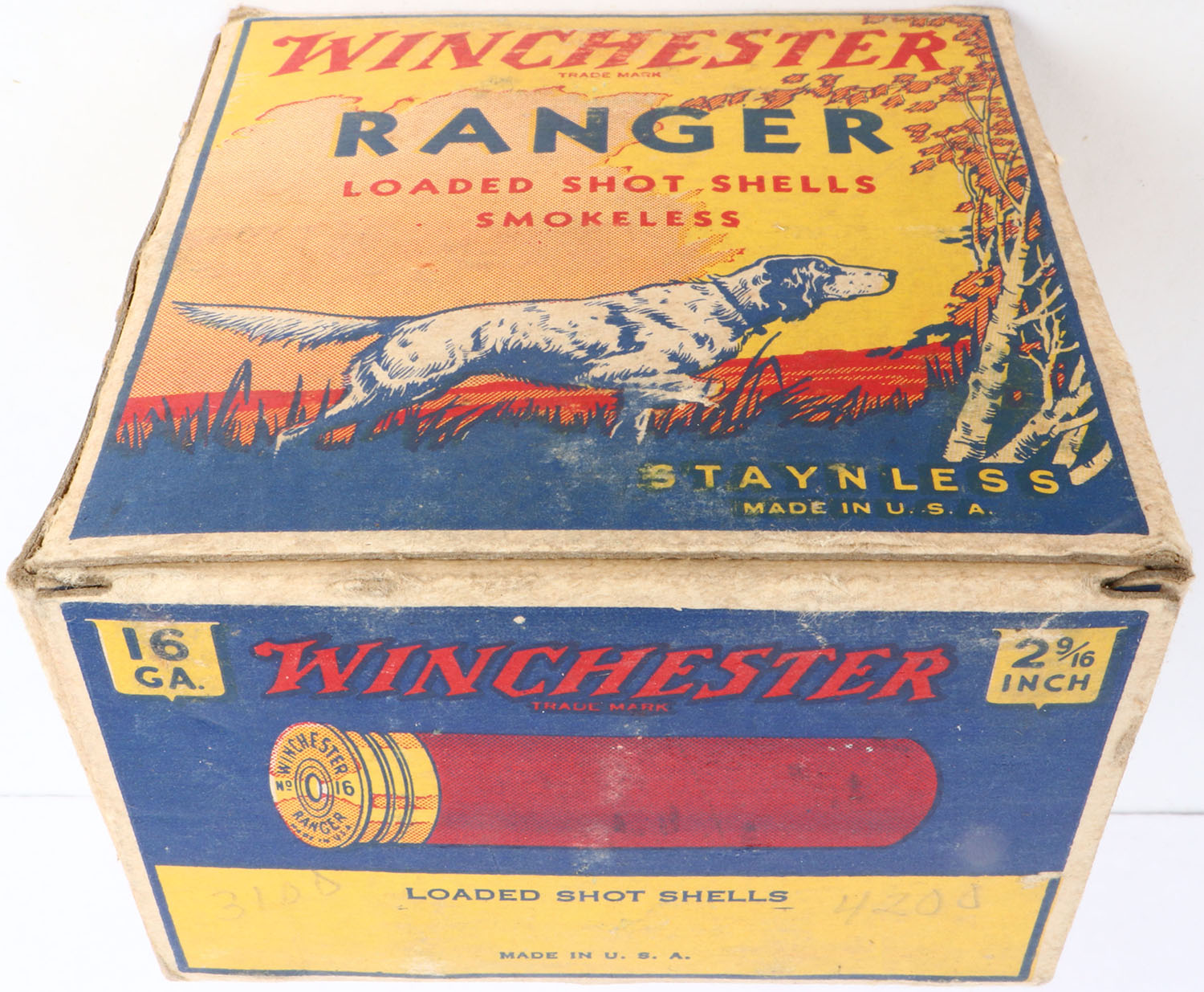 Winchester, Ranger, 16ga, 1pc., Full, shot size 5, multi colored box, dog on point, shells 2 9/16'', box is solid with light age soiling, shell protrusion & great colors, shells are very good. Grade: Excellent - Value: 20 to 80