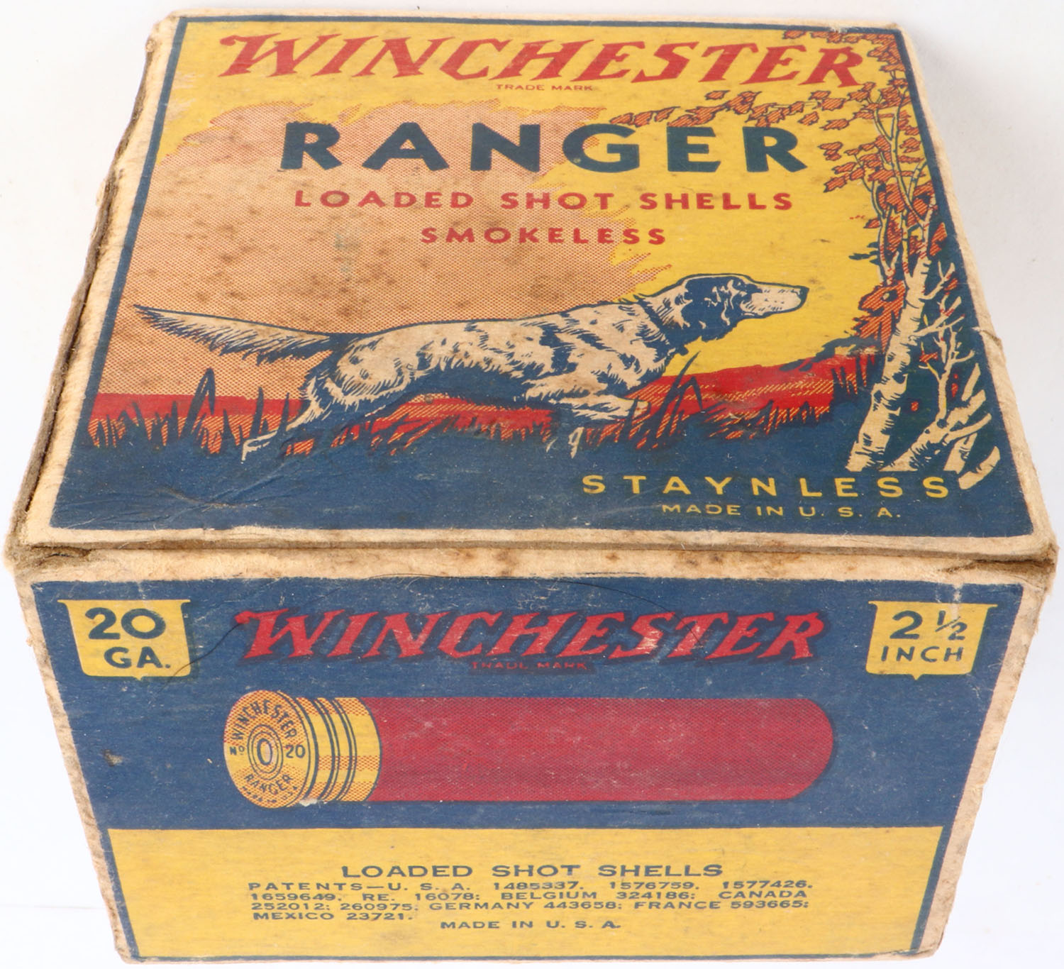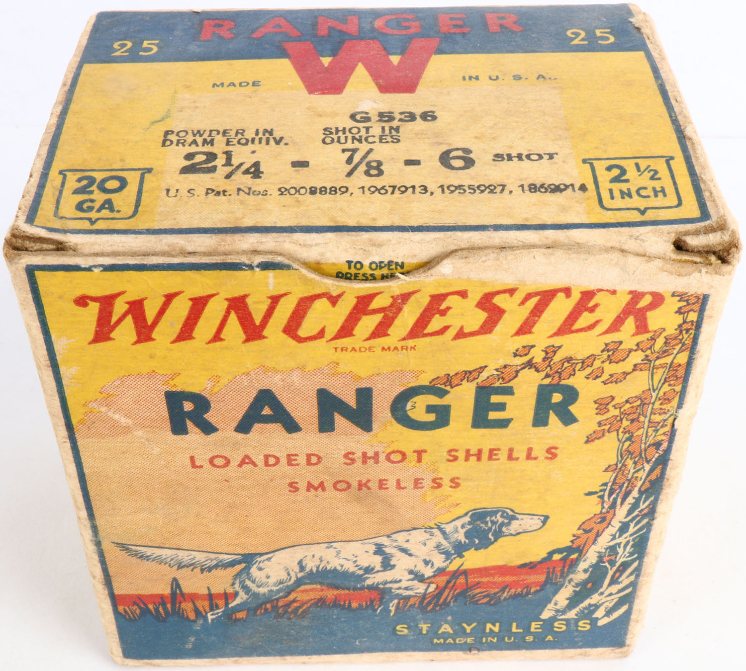 Winchester, Ranger, 20ga, 1pc., Empty, shot size 6, multi colored box, dog on point, shells 2 1/2'', box is solid with light soiling, light edge wear & great colors, box has torn inside top flap. Grade: Excellent - Value: 20 to 60