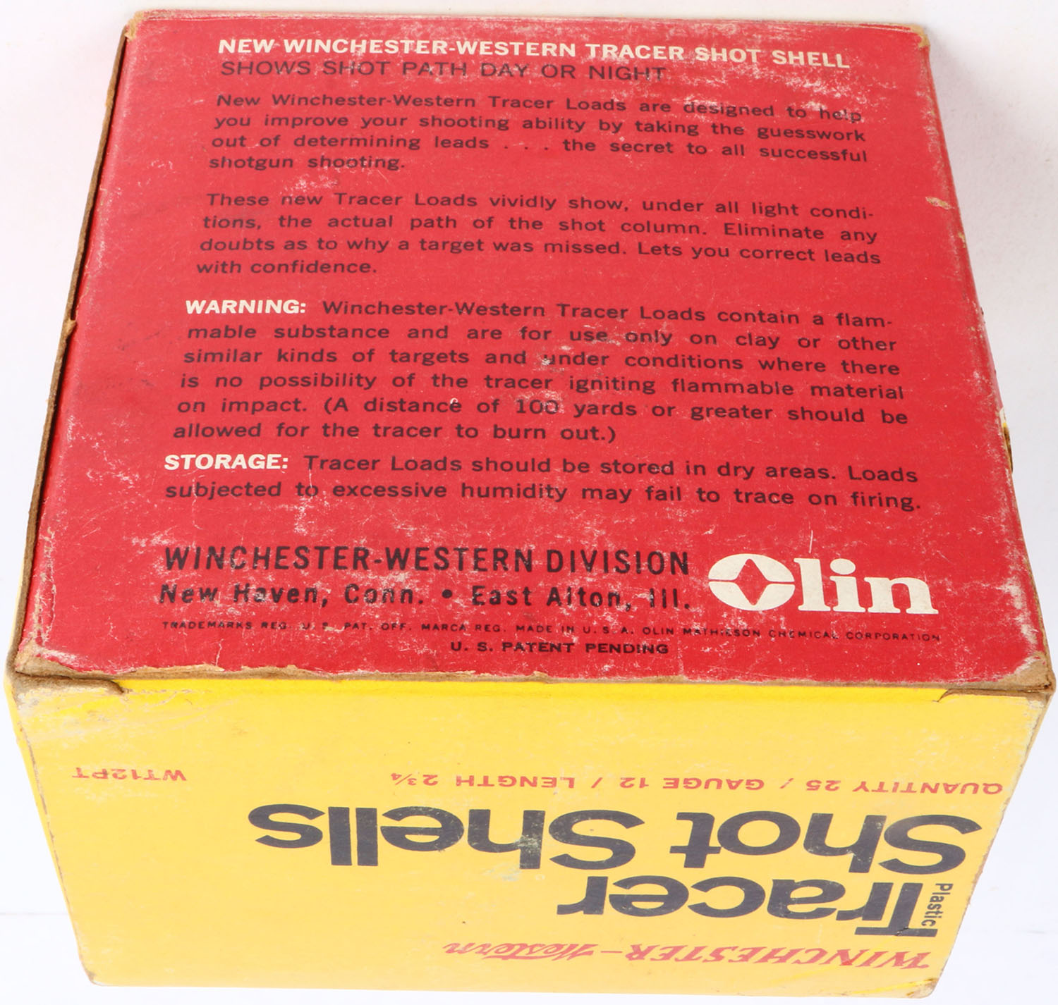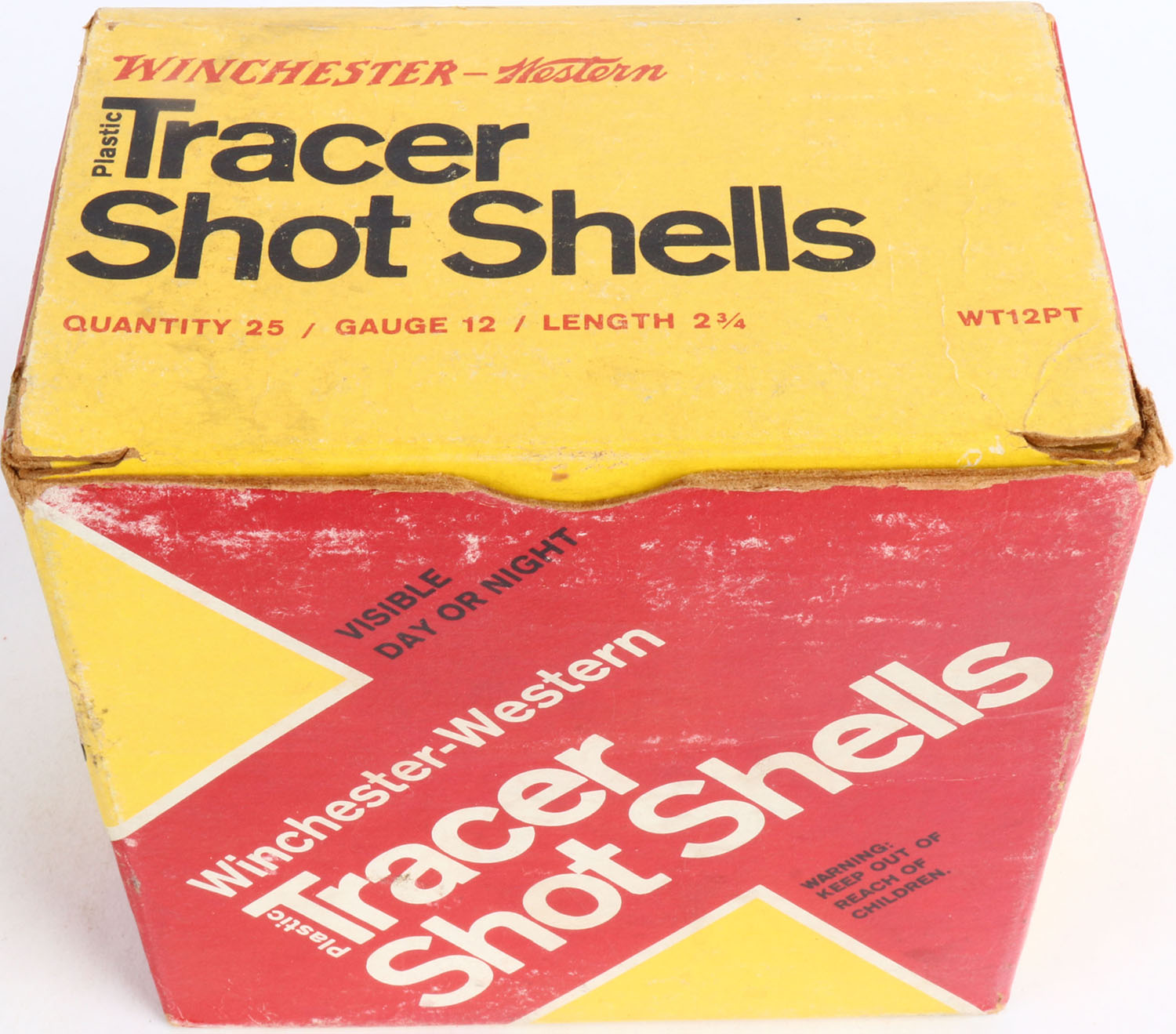 Winchester-Western, Tracer Shot Shells, 12ga., 1pc., Partial 22rds, VISIBLE DAY OR NIGHT, red, yellow & white box, box is solid with light scuffing, some shells have spilt brass but are very clean. Grade: Very Good ++ - Value: 10 to 30