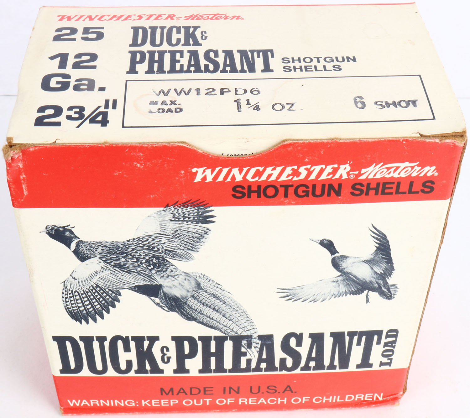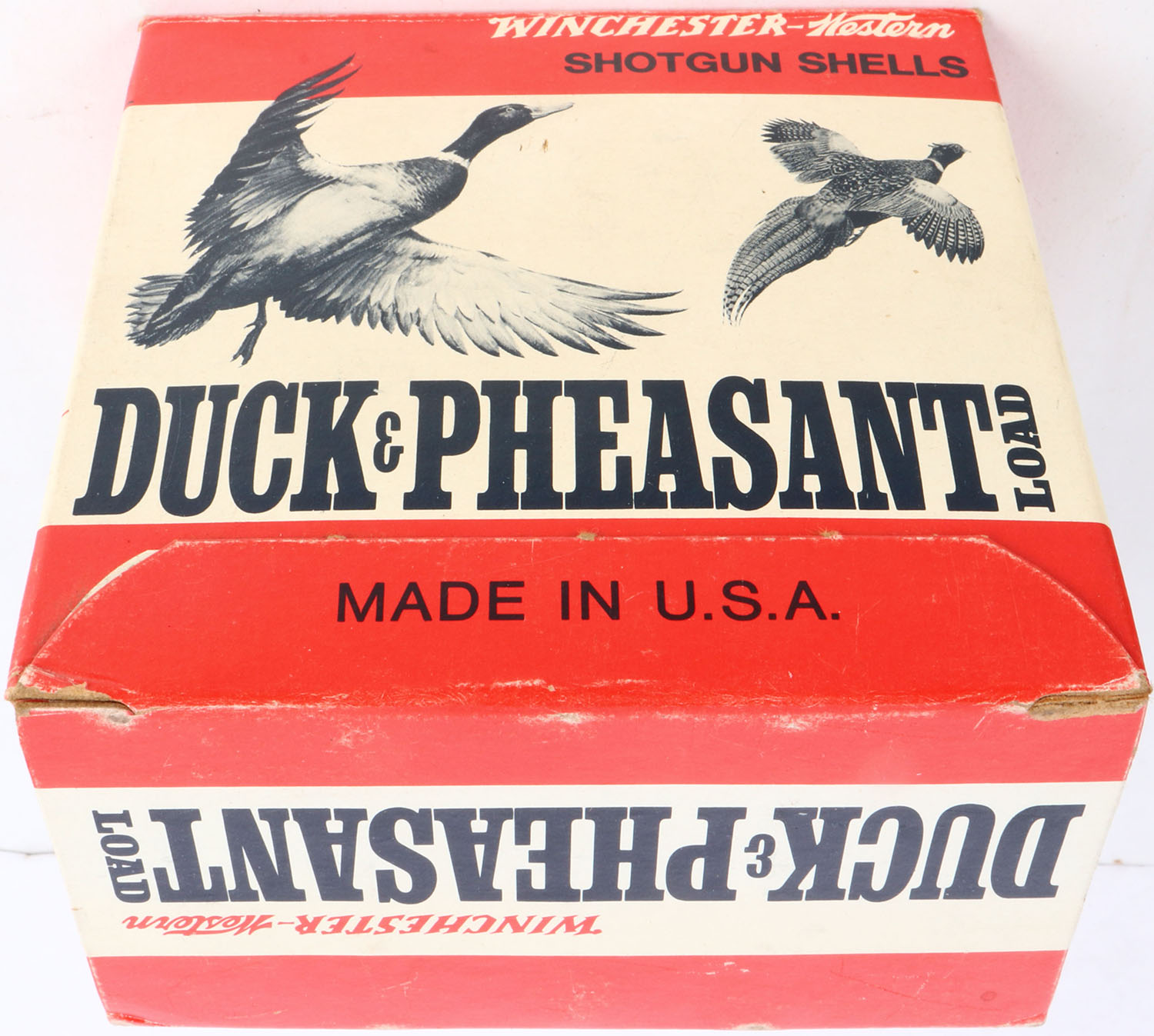 Winchester-Western, Duck & Pheasant, 12ga, 1pc., Full, multi-colored box, shot size 6, box is solid with excellent colors, Shells are excellent. Grade: Excellent - Value: 10 to 30