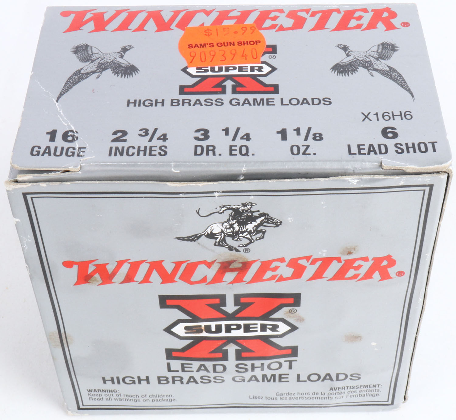 Winchester, Super-X High Brass Game Loads, 16ga., 1pc., Full, 2 3/4'', shot size 6 Lead Shot, multi colored box, box has great colors, shells are excellent. Grade: Excellent - Value: 10 to 30