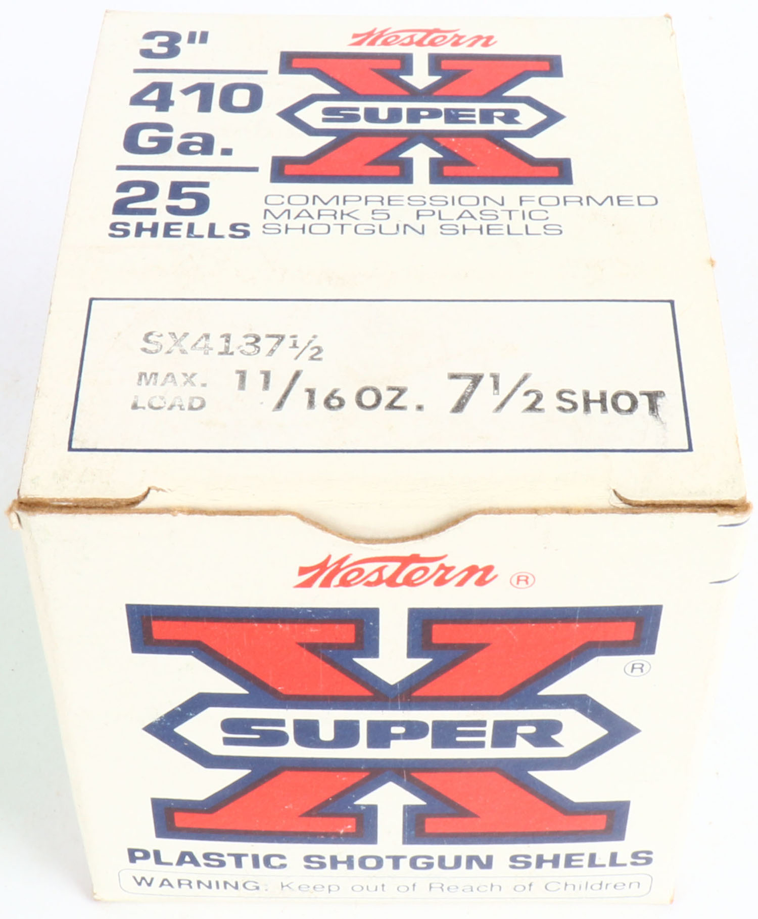 Winchester, Super-X, 410ga., 1pc., Full, 3'', shot size 7 1/2, multi colored box, box has great colors, shells are excellent. Grade: Excellent - Value: 10 to 30