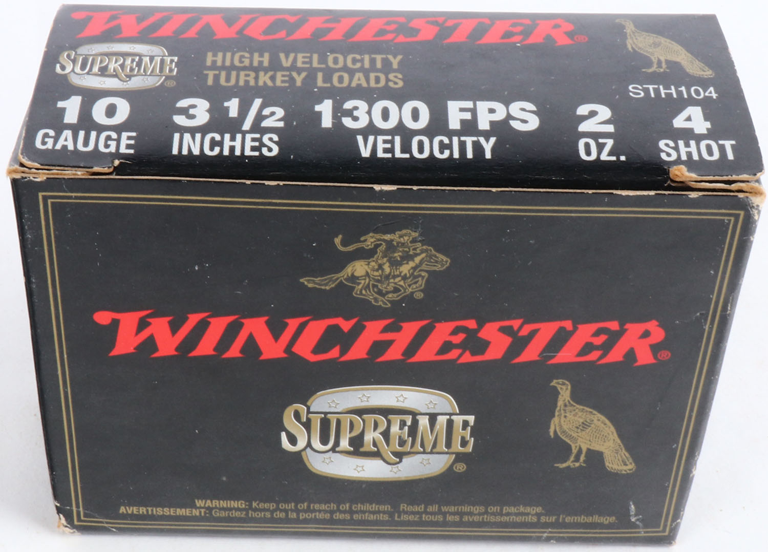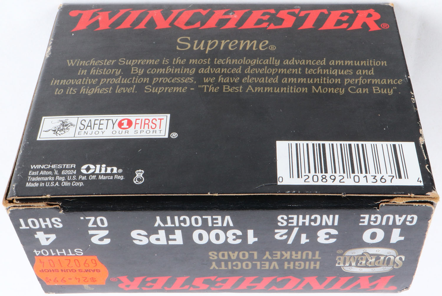 Winchester, Supreme Turkey Loads, 10ga., 1pc., Full, shot size 4, box is solid & shells are excellent. Grade: Excellent + - Value: 8 to 30