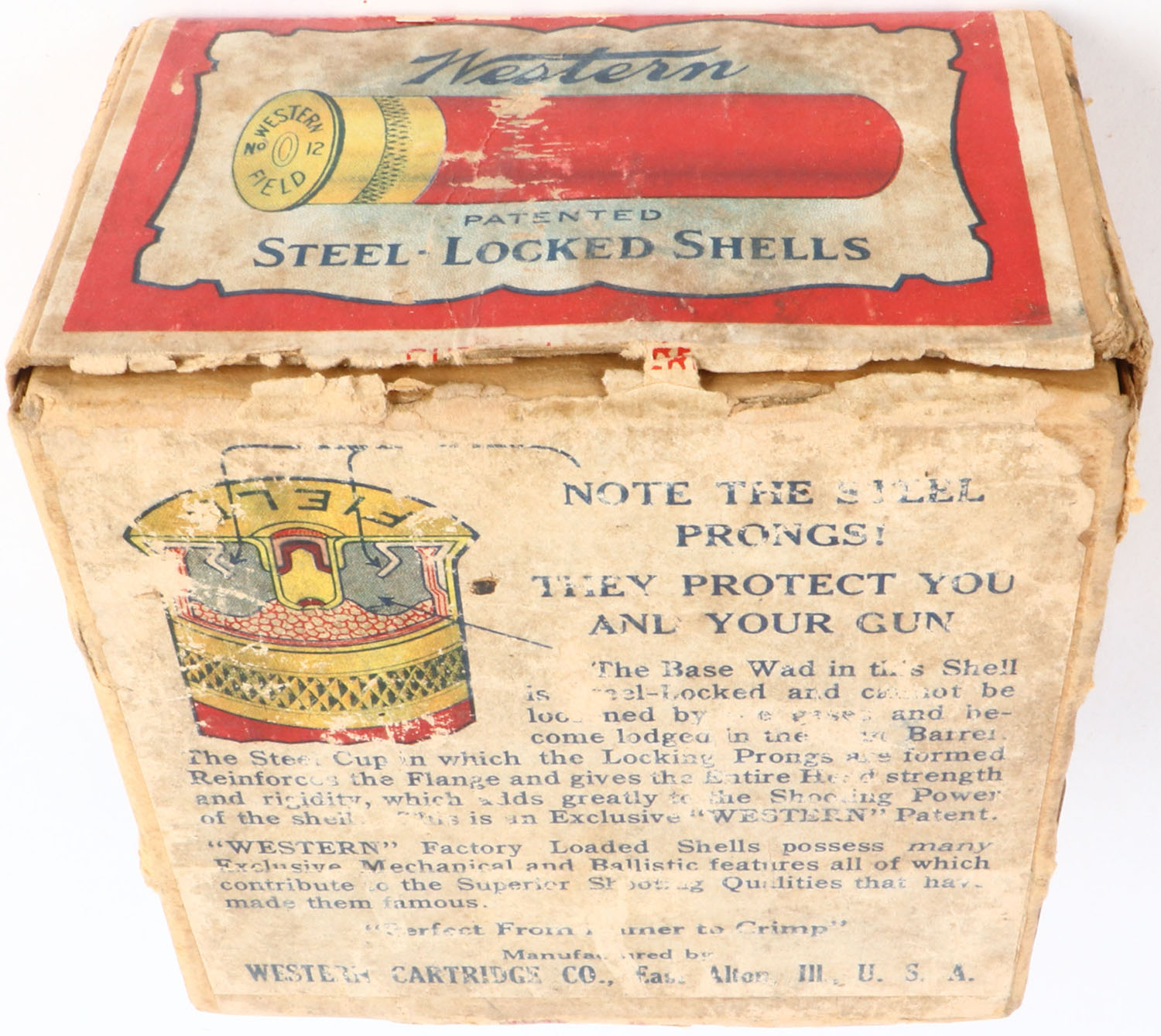 Western, Field/Super X, Label was made during transition from Field boxes to Super X boxes. 12ga., 2pc, Full with 2rds being incorrect shot size, shot size 6 Ch, box has age soiling, light scuffing, tape repair & glue repair with nice label, Shells are excellent. Grade: Very Good ++ - Value: 80 to 200