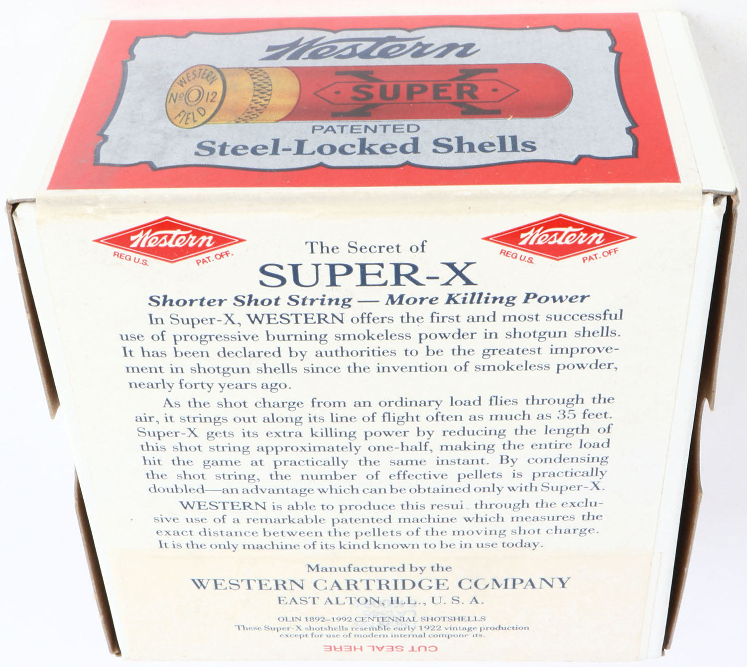 Western, Super-X, 12ga., 2pc., FULL & SEALED, shot size 6 Chilled Shot, 2 3/4'', white box with multi colored label, box & label are great, Circa 1990's. Grade: Excellent ++ - Value: 30 to 80