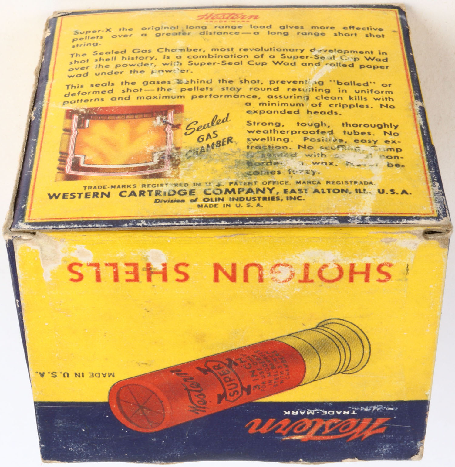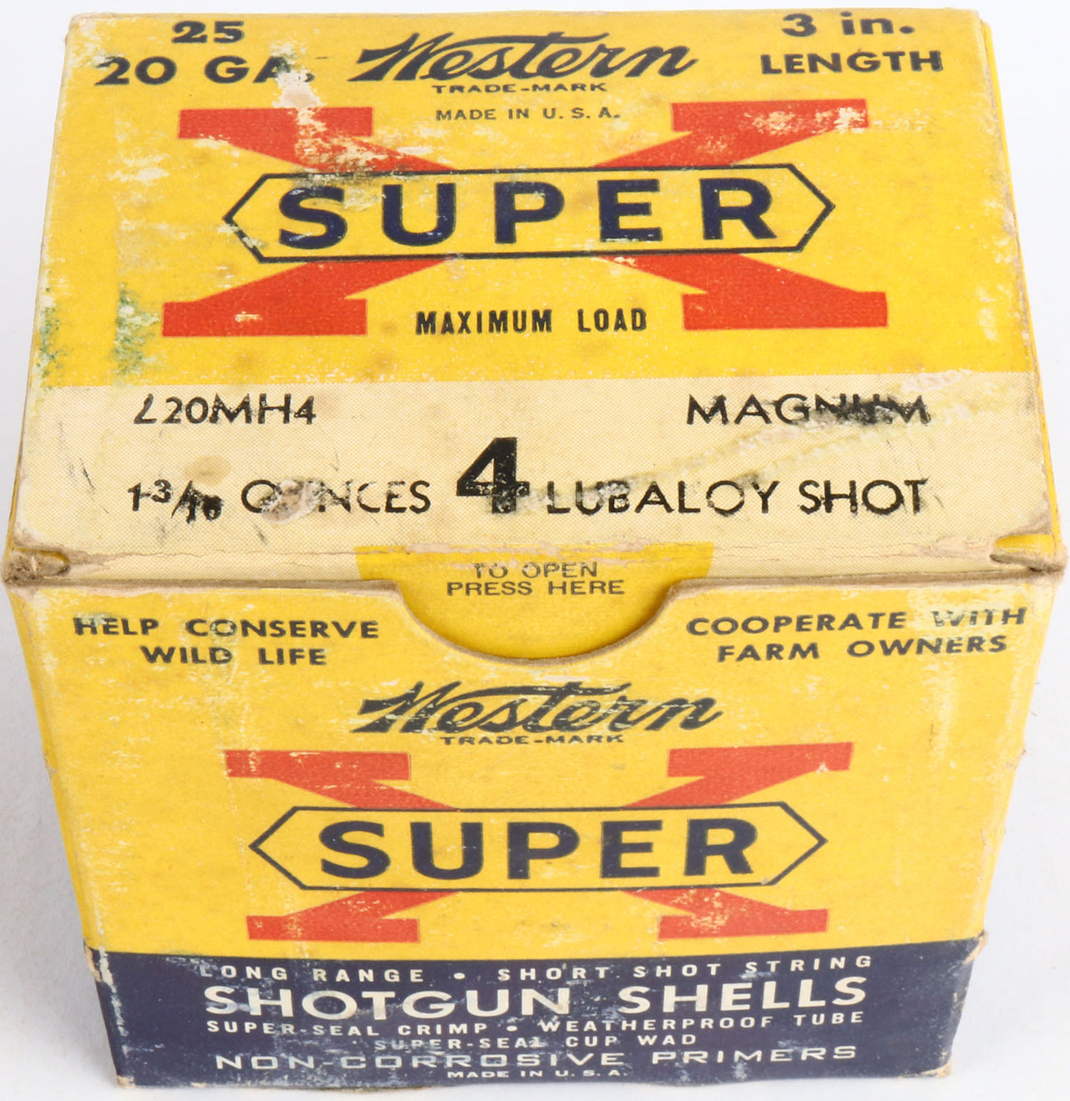 Western, Super X, 20ga., 3'', 1pc., Partial 20rds., shot size 4 Lubaloy, multi-colored box, box is solid with scuffing, box has great colors, shells are excellent. Grade: Very Good ++ - Value: 10 to 30