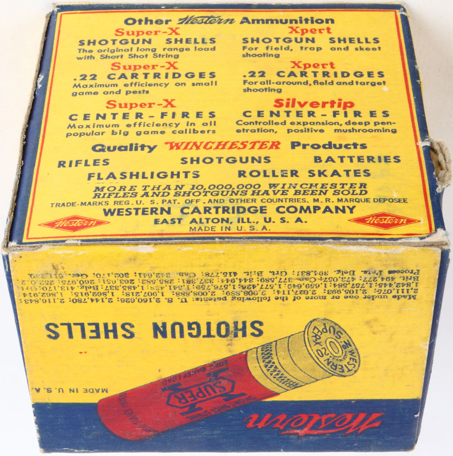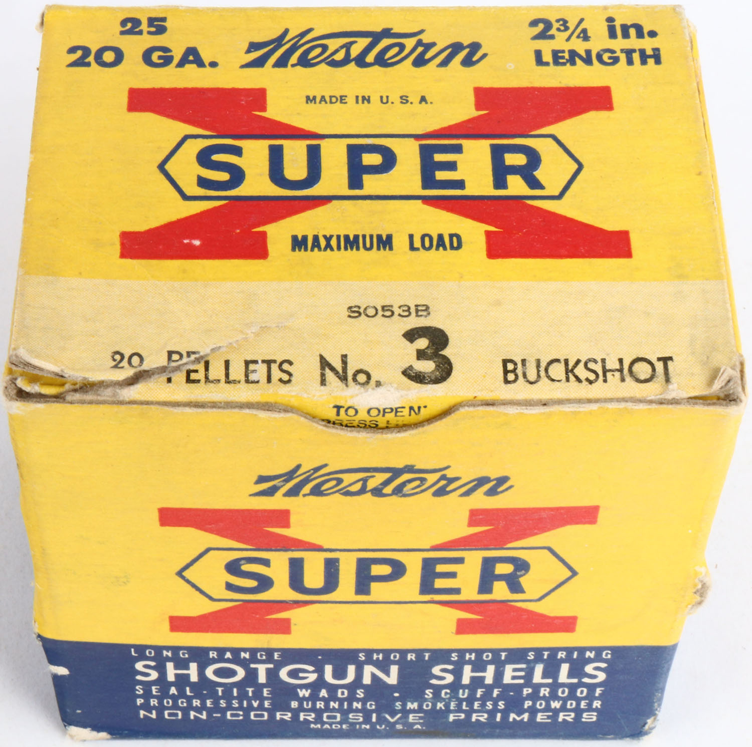Western, Super X, 20ga., 2 3/4'', 1pc., Full, shot size 3 Buckshot, multi-colored box, box has tear & shell protrusions, box has great colors, shells are excellent. Grade: Very Good ++ - Value: 10 to 30
