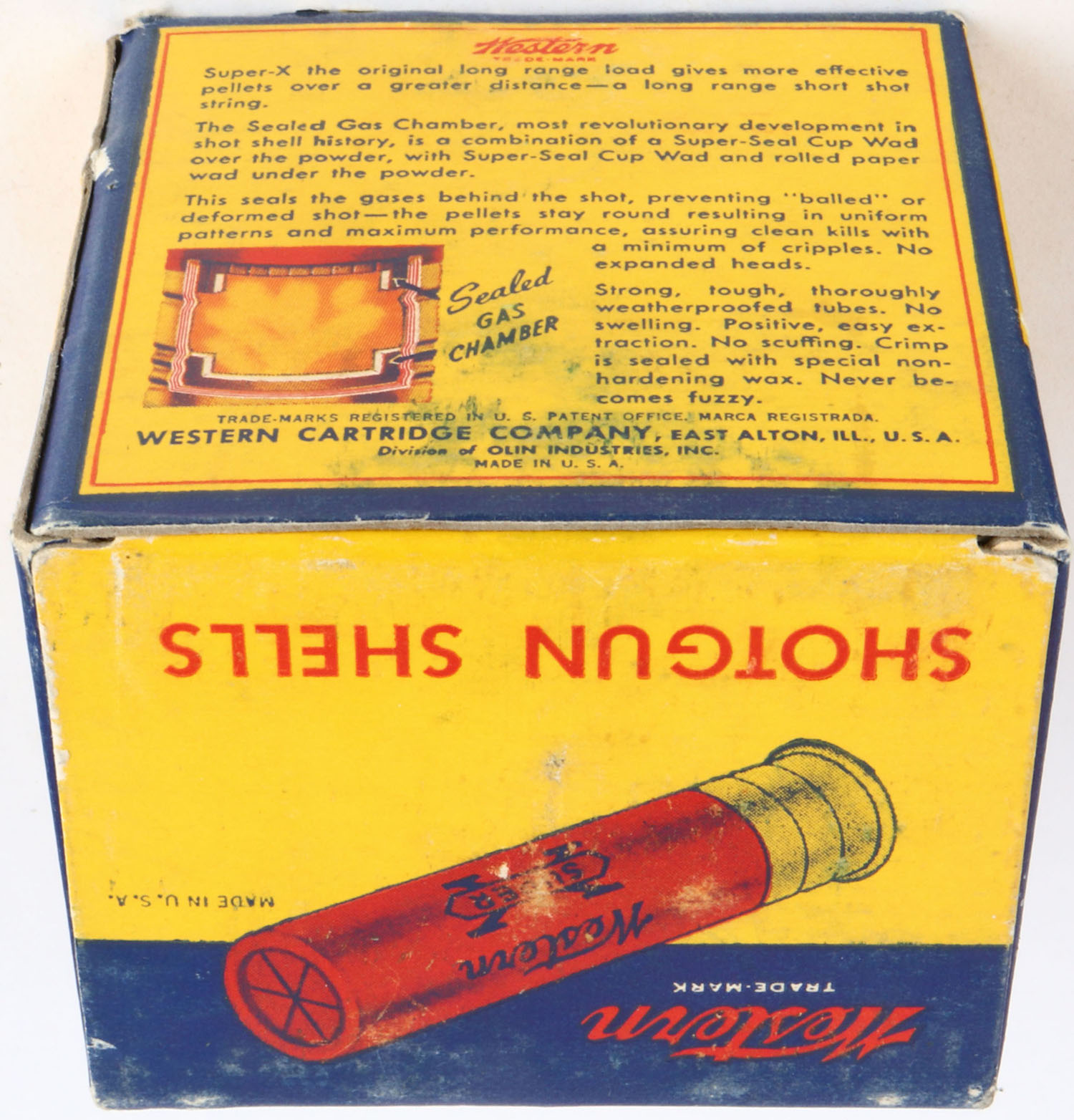 Western, Super X, 28ga., 2 3/4'', 1pc., Full, shot size 9 Skeet Load, multi-colored box, box is solid with light soiling, box has great colors, shells are excellent. Grade: Excellent + - Value: 10 to 30