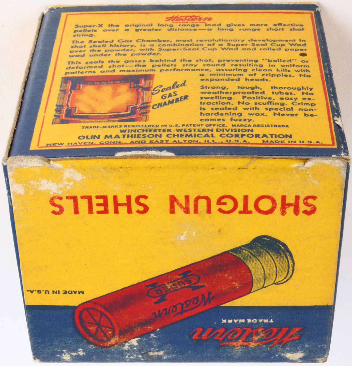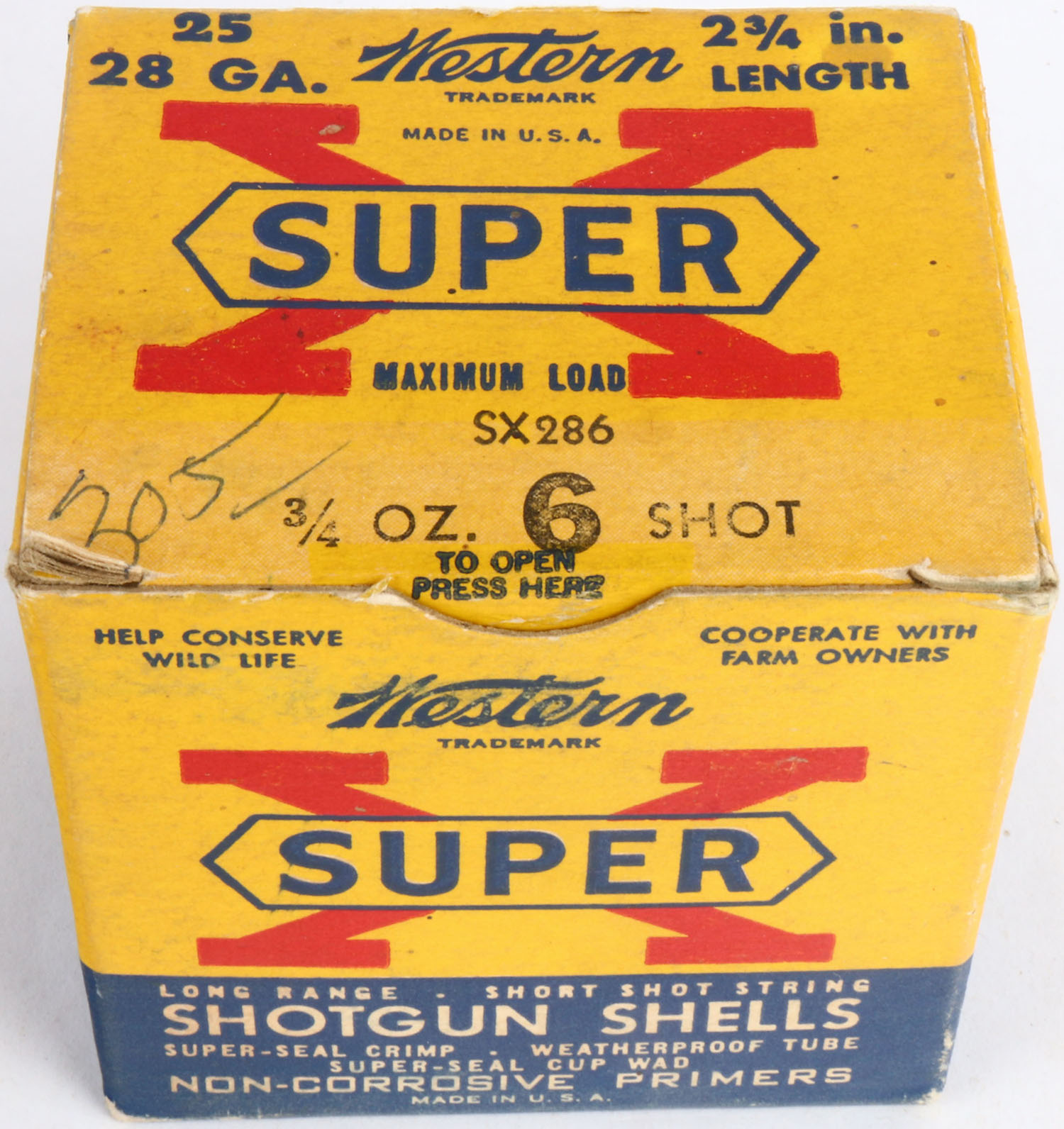 Western, Super X, 28ga., 2 3/4'', 1pc., Full, shot size 6, multi-colored box, box is solid with light scuffing, box has great colors, shells are excellent. Grade: Excellent - Value: 10 to 30