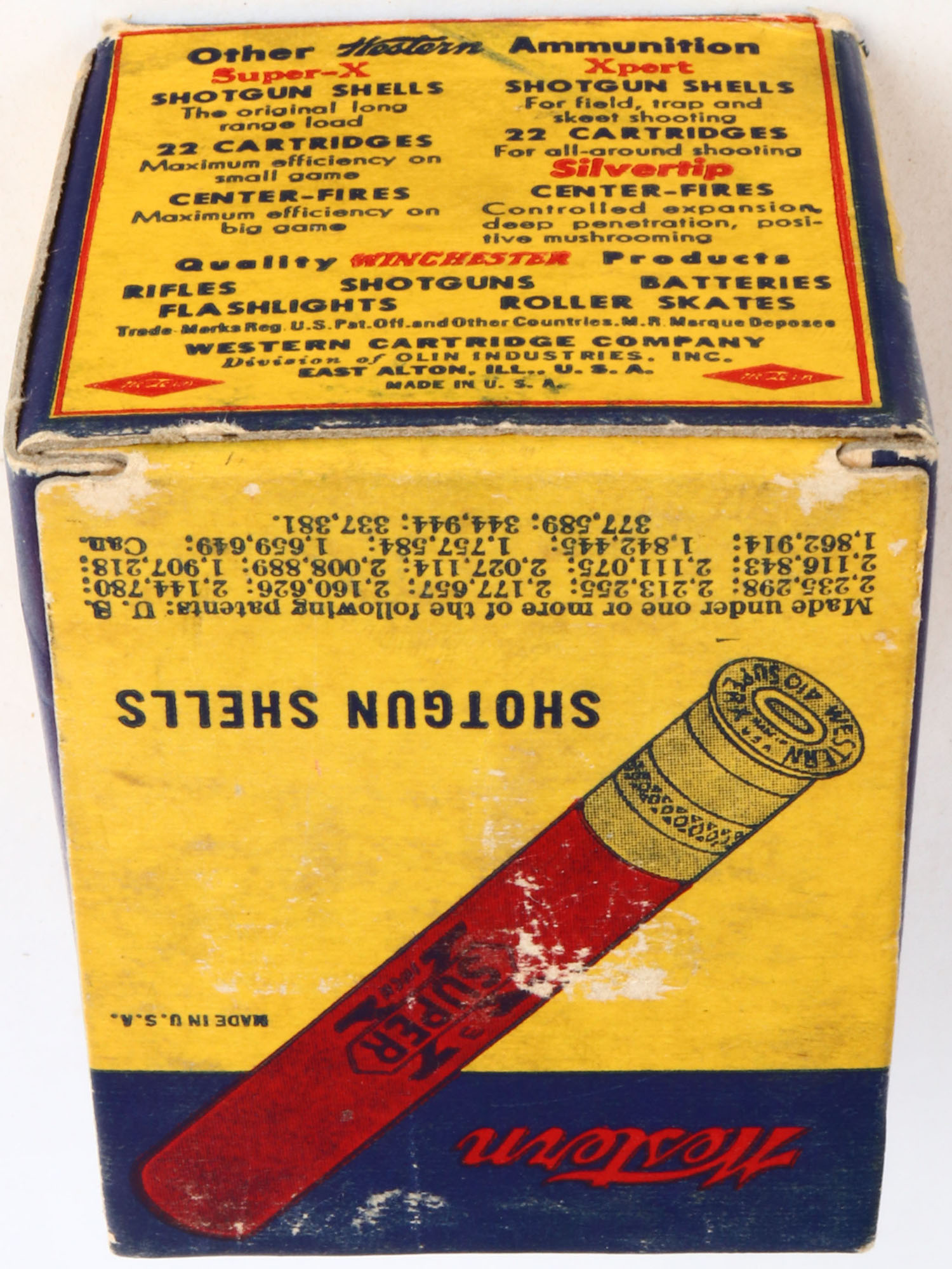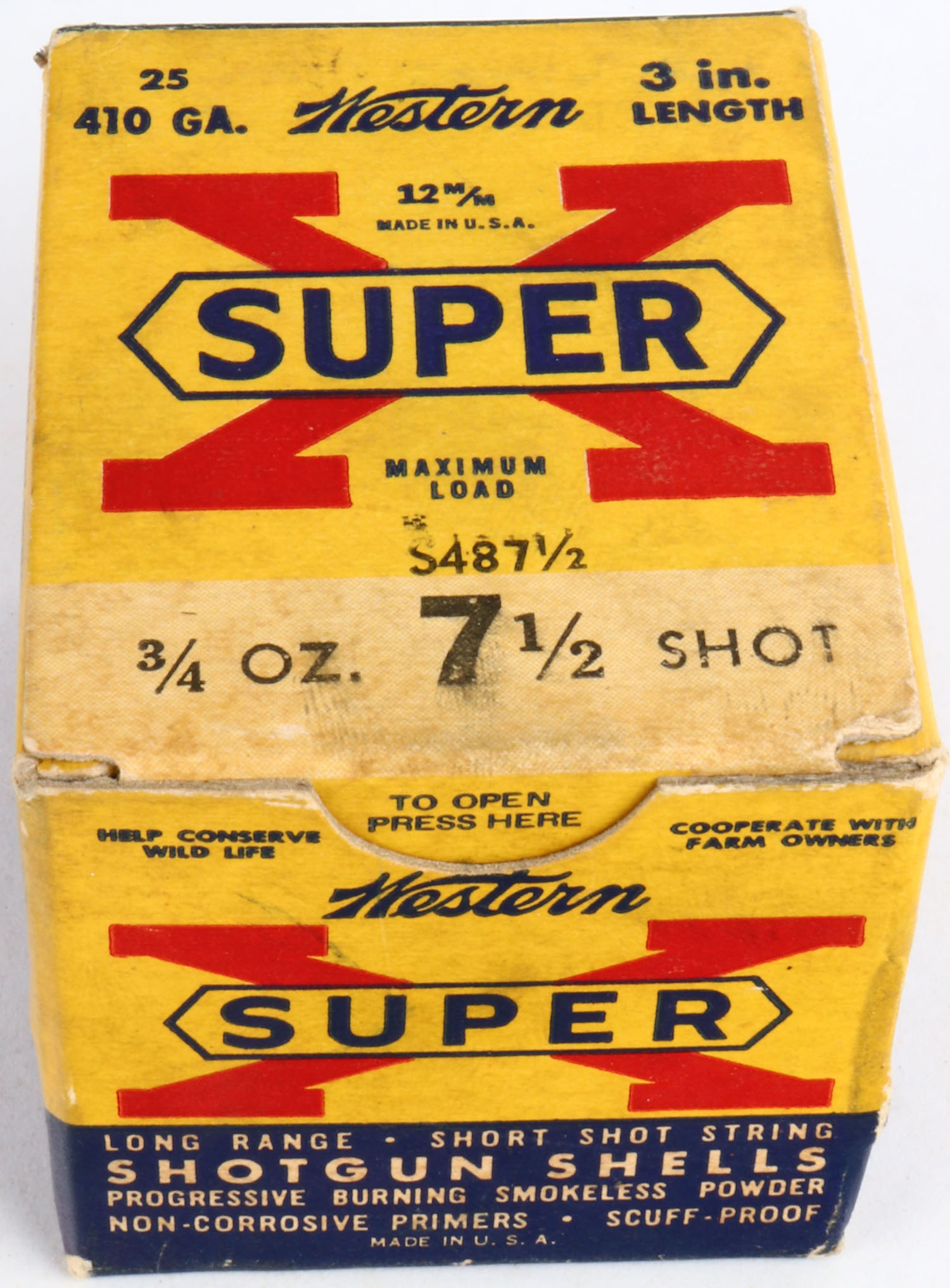 Western, Super X, 410ga., 3'', 1pc., Full, shot size 7 1/2, multi-colored box, box is solid with light age soiling, box has great colors, shells are excellent. Grade: Excellent - Value: 10 to 30