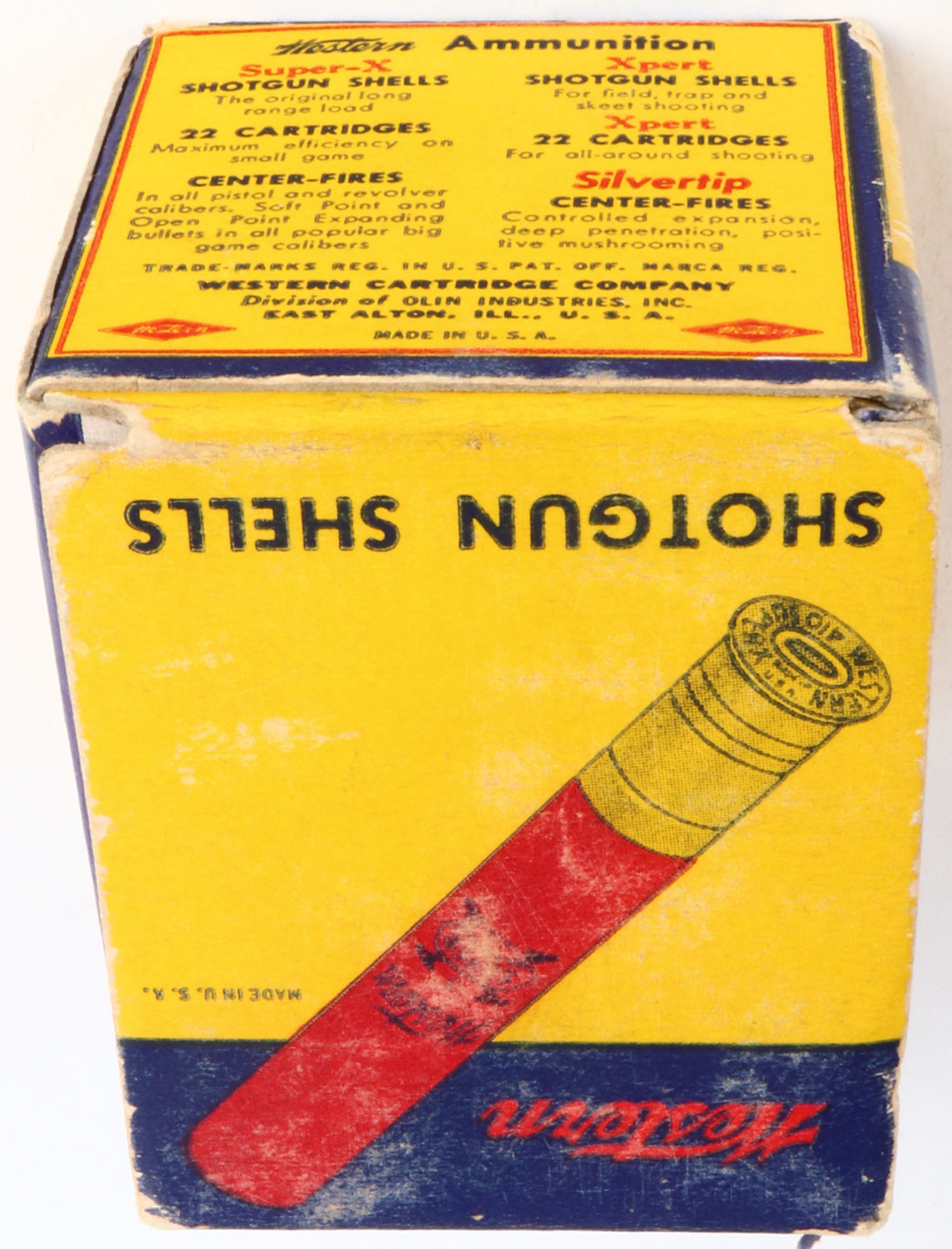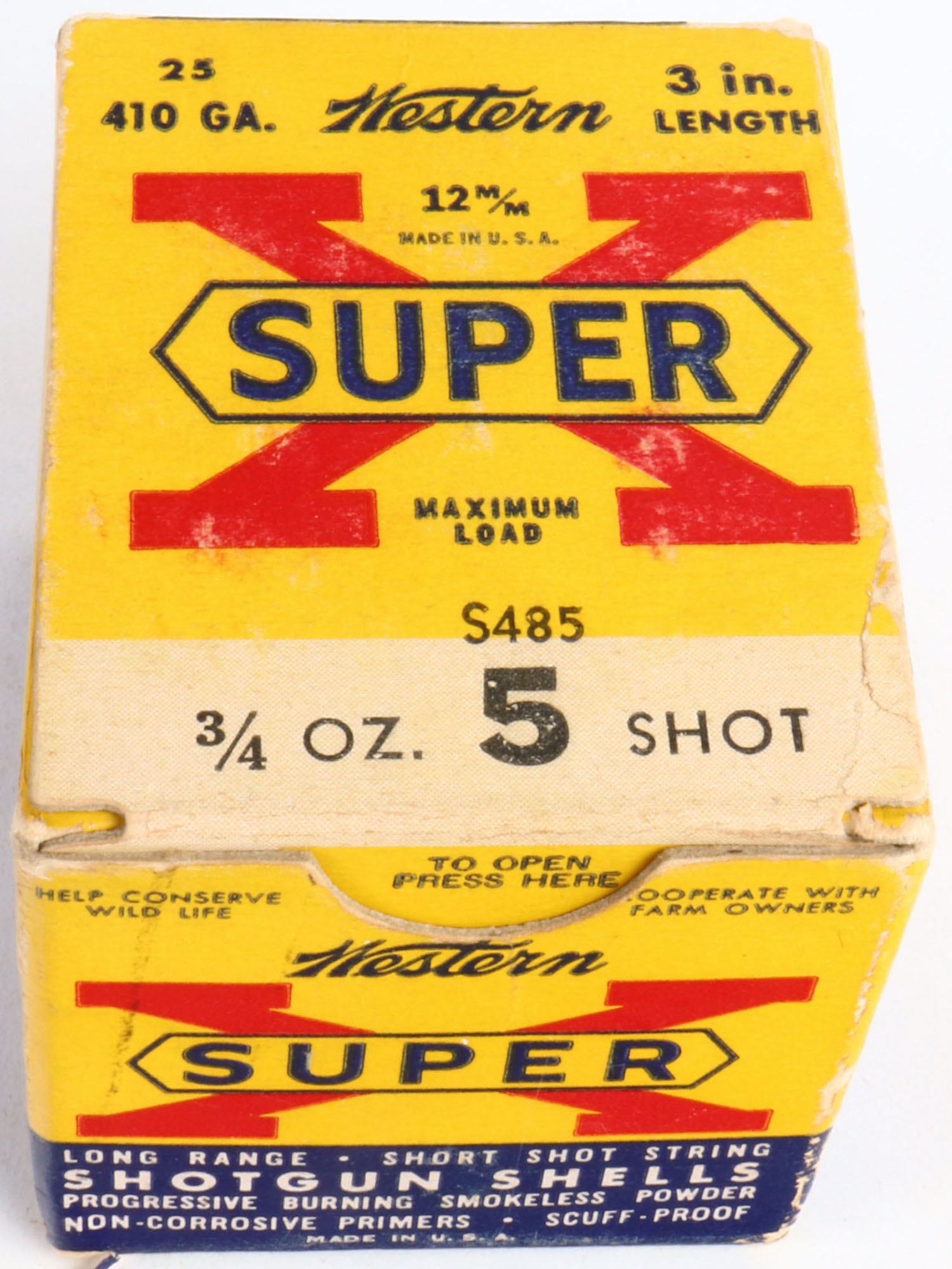 Western, Super X, 410ga., 3'', 1pc., Full, shot size 5, multi-colored box, box is solid with light scuffing, box has great colors, shells are excellent. Grade: Excellent - Value: 10 to 30