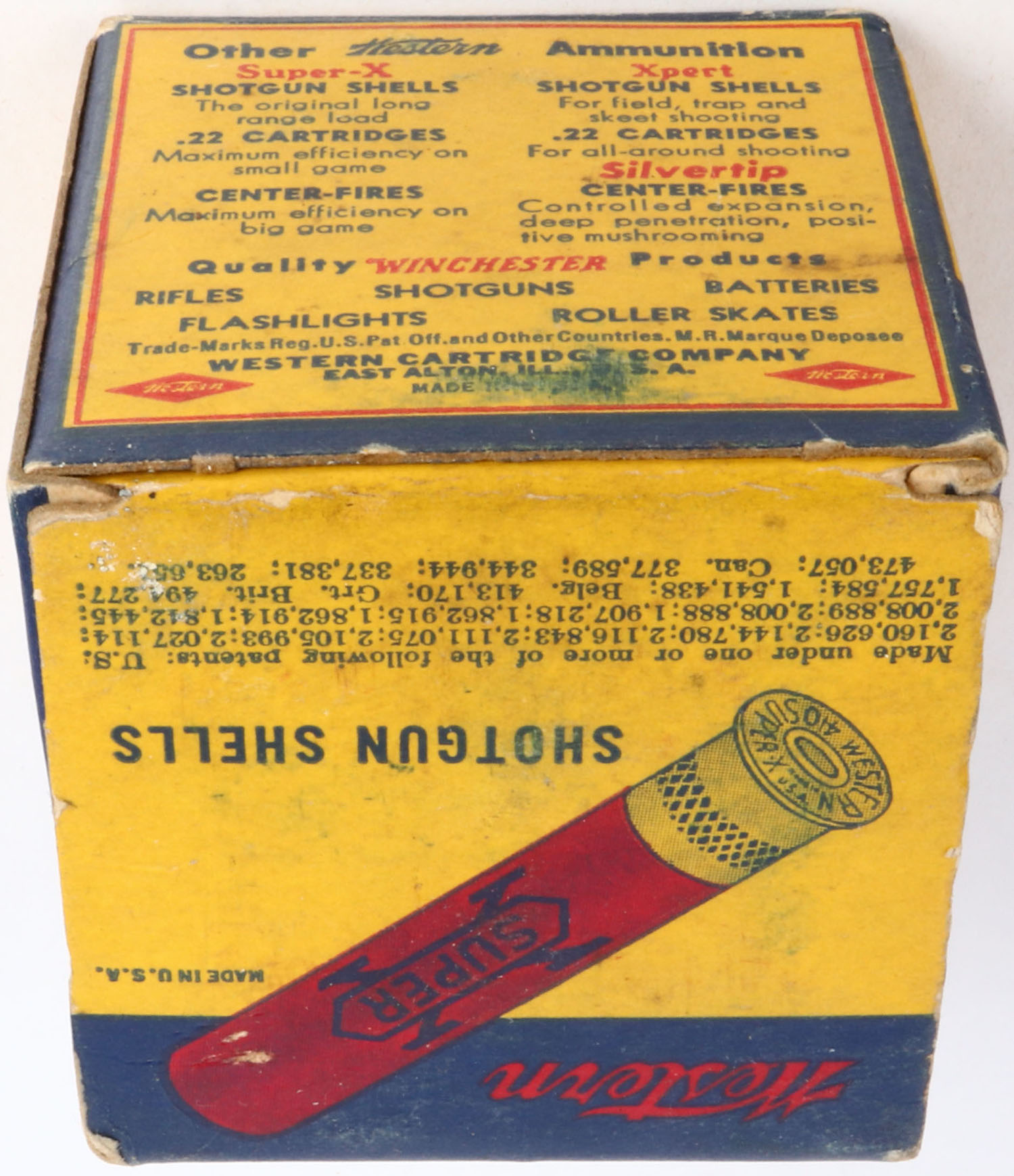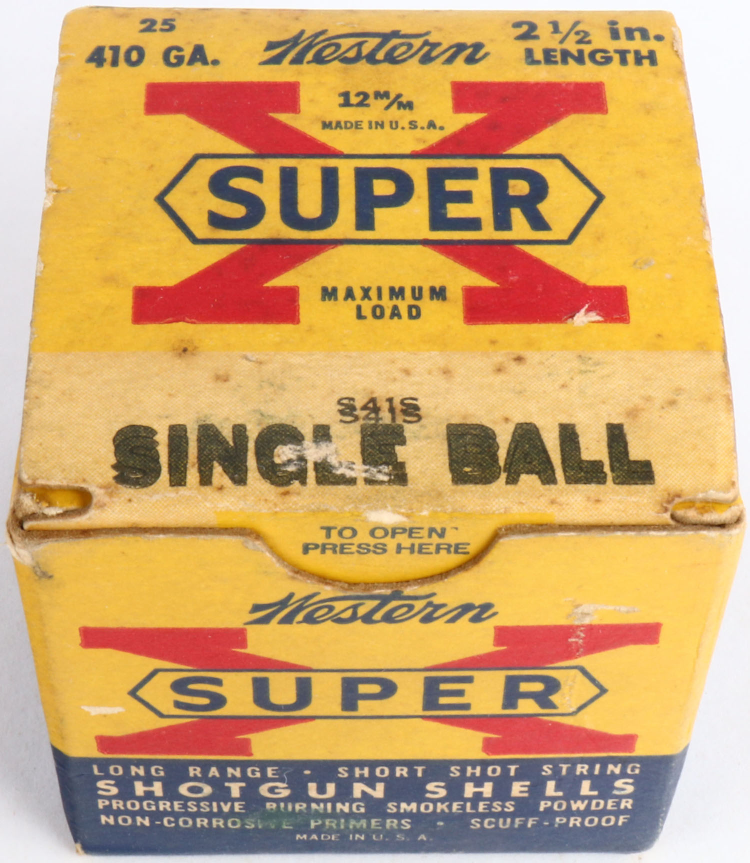 Western, Super X, 410ga., 2 1/2'', 1pc., Full, shot size Single Ball, multi-colored box, box is solid with light soiling, box has great colors, shells are excellent. Grade: Excellent - Value: 10 to 30