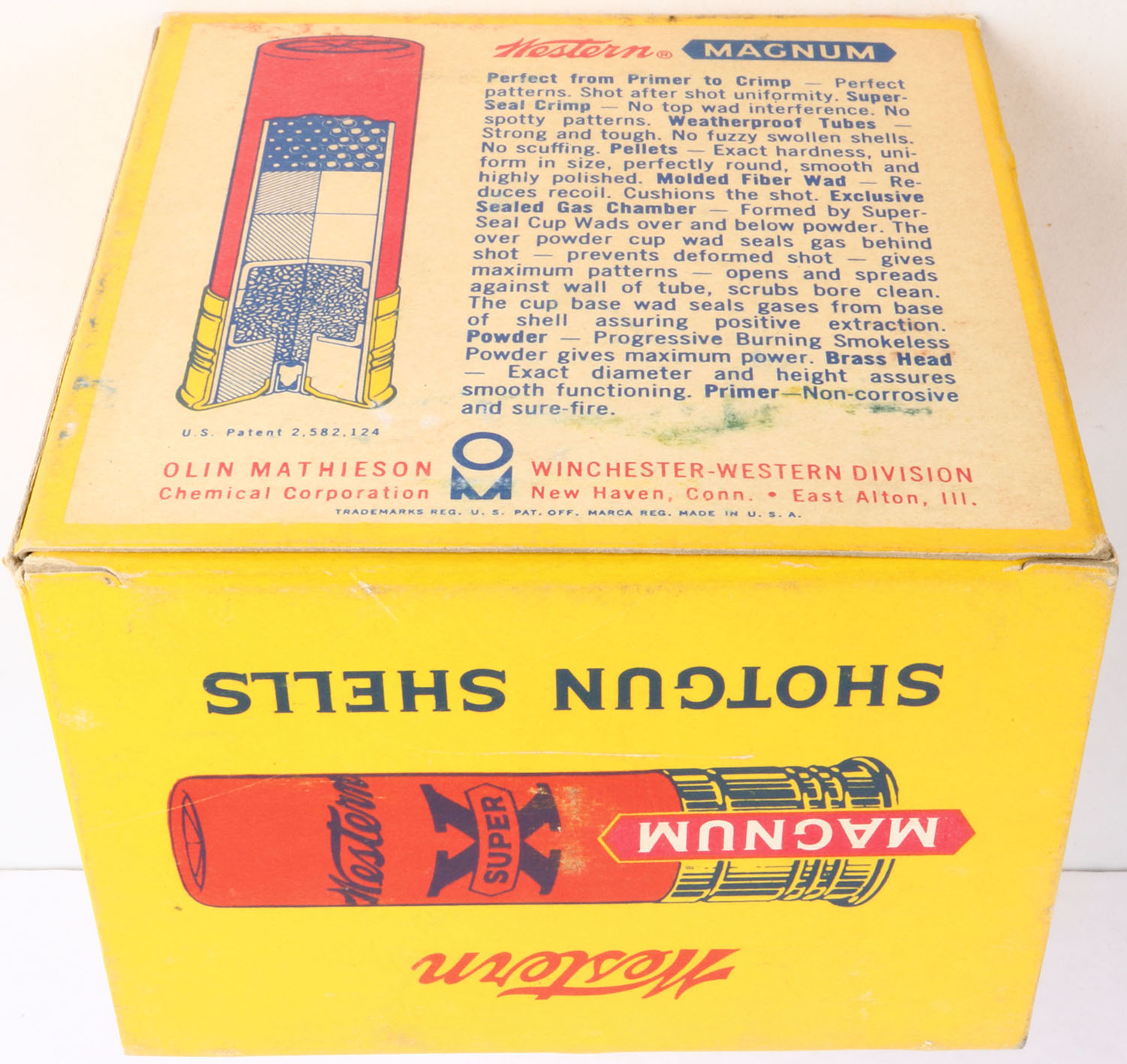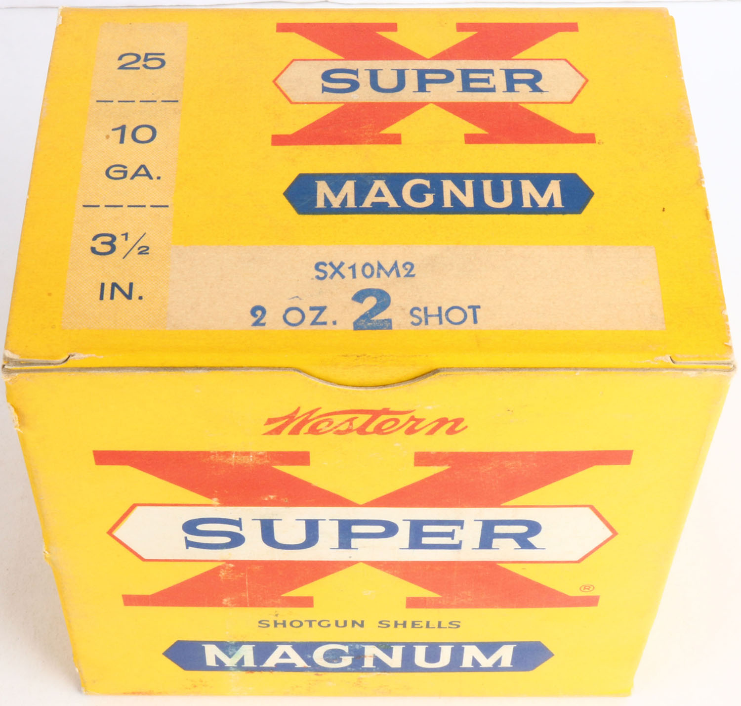 Western, Super X, 10ga., 3 1/2'', 1pc., Full, shot size 2 Magnum, yellow, blue & red box, box is very solid with very light soiling, box has great colors, shells are excellent. Grade: Excellent + - Value: 20 to 50