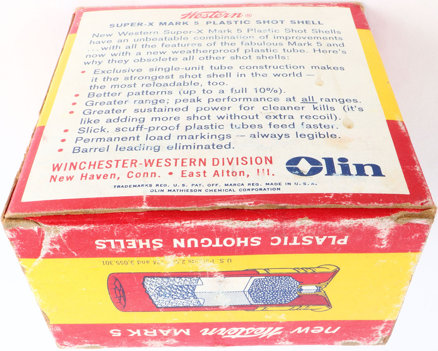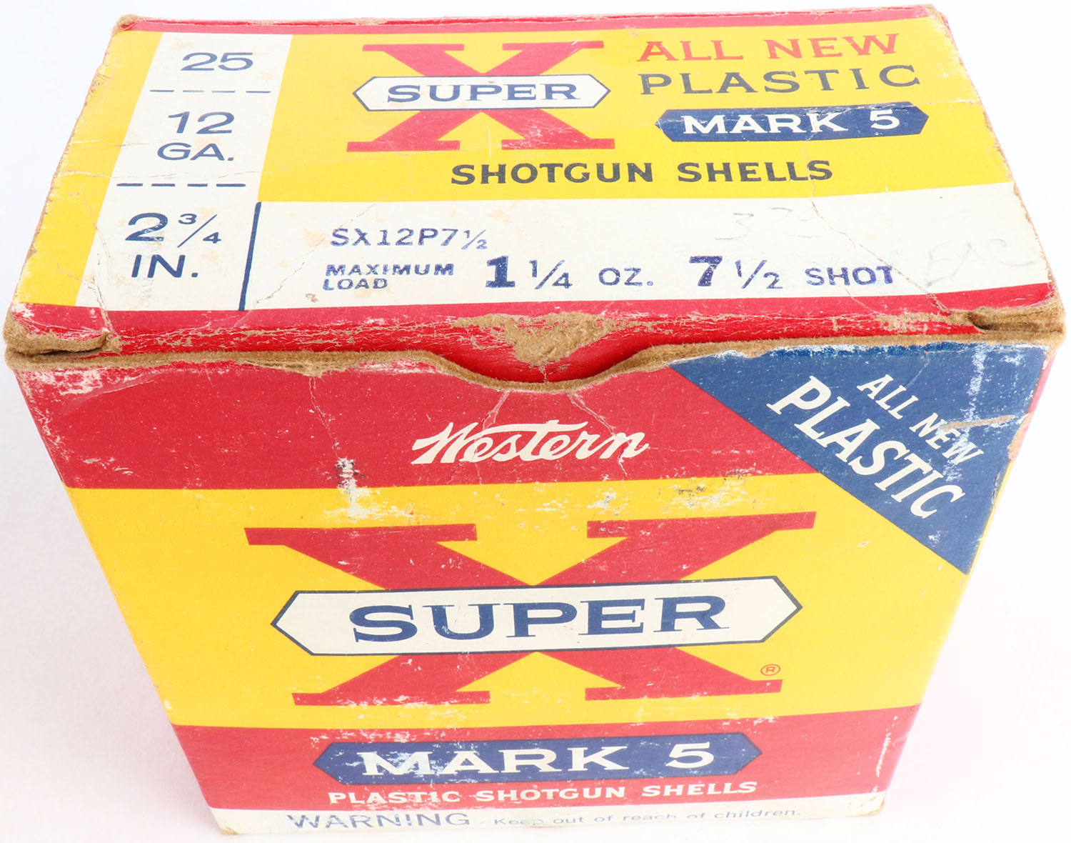 Western, Super X, Mark 5, 12ga., 2 3/4'', 1pc., Full, shot size 7 1/2, multi-colored box, box is solid with scuffing & light edge wear, box has very nice colors, shells are excellent. Grade: Very Good ++ - Value: 10 to 30