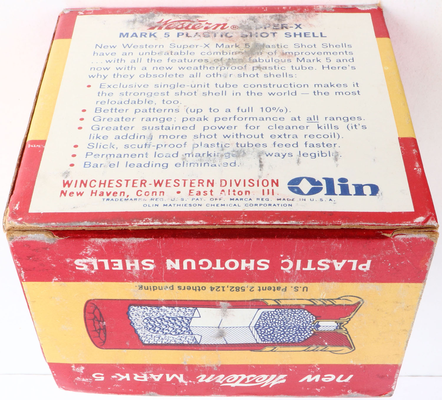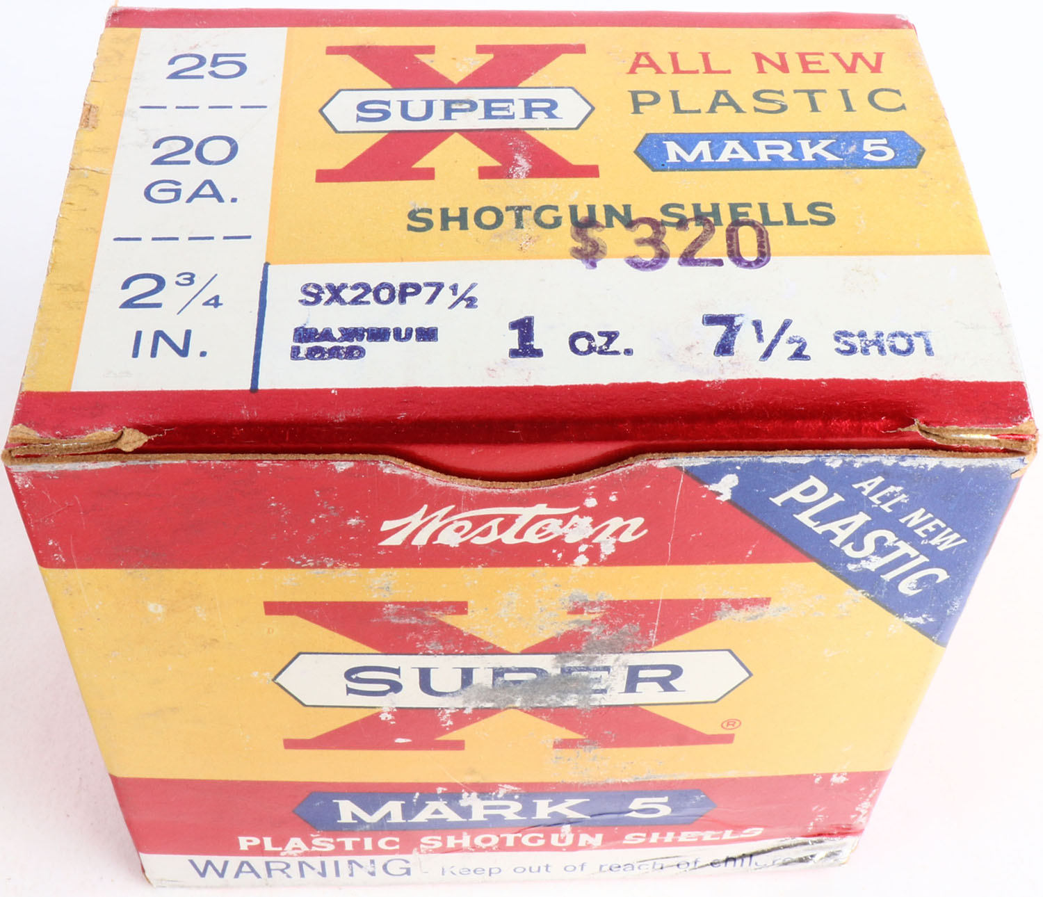Western, Super X, 20ga., 2 3/4'', 1pc., Full, shot size 7 1/2, multi-colored box, box is solid with scuffing, box has great colors, shells are excellent. Grade: Excellent - Value: 10 to 30