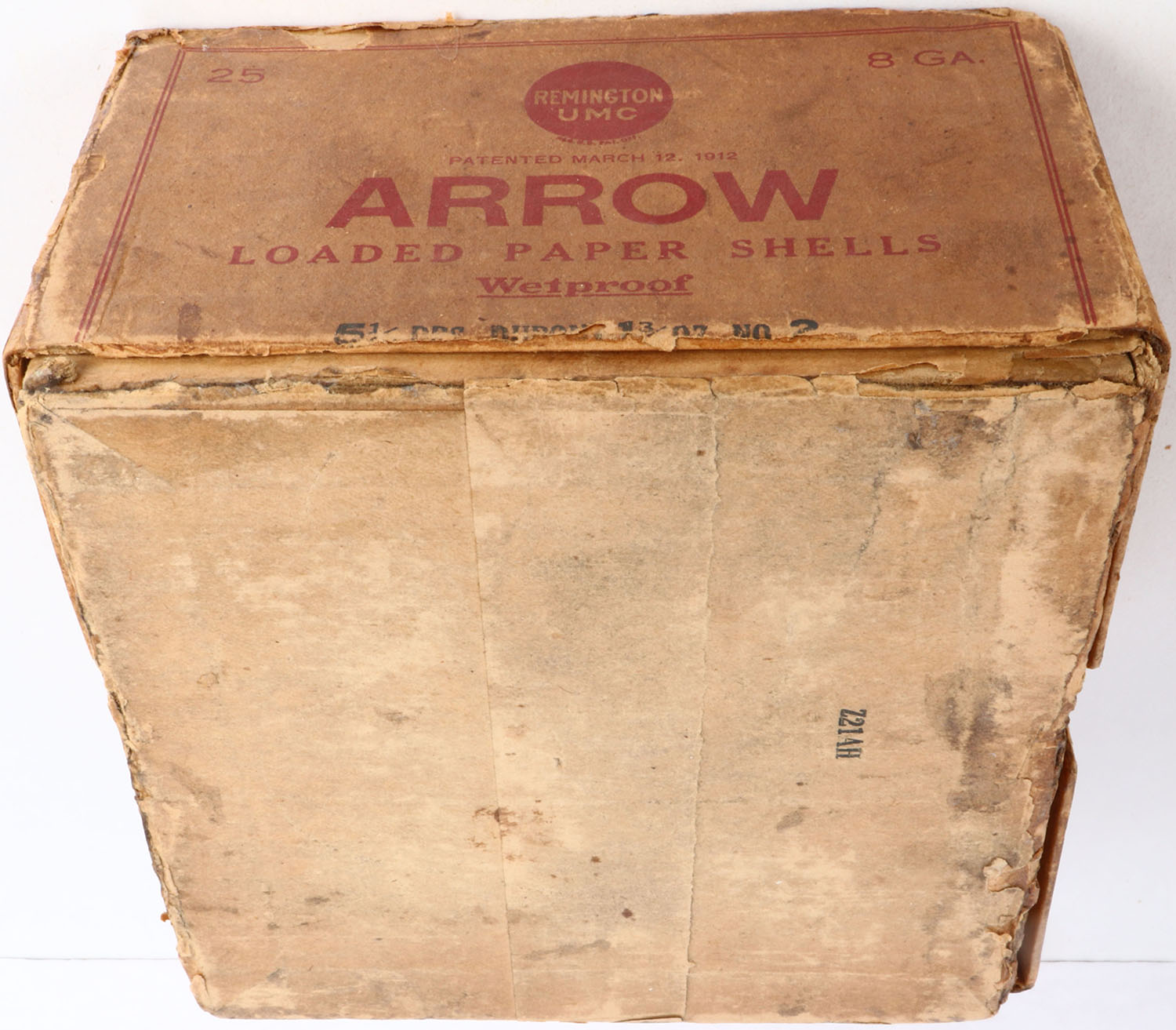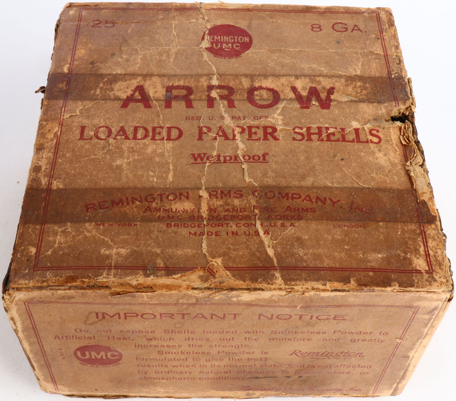 Remington, ARROW, 8ga., 2pc., Full with 4rds being fired, reprimed & refilled with shot, shot size 2, buff box with buff & red label, box & label are nice with glue repair, edge wear, age soiling & scuffing, Shells are excellent. Grade: Very Good - Value: 100 to 600