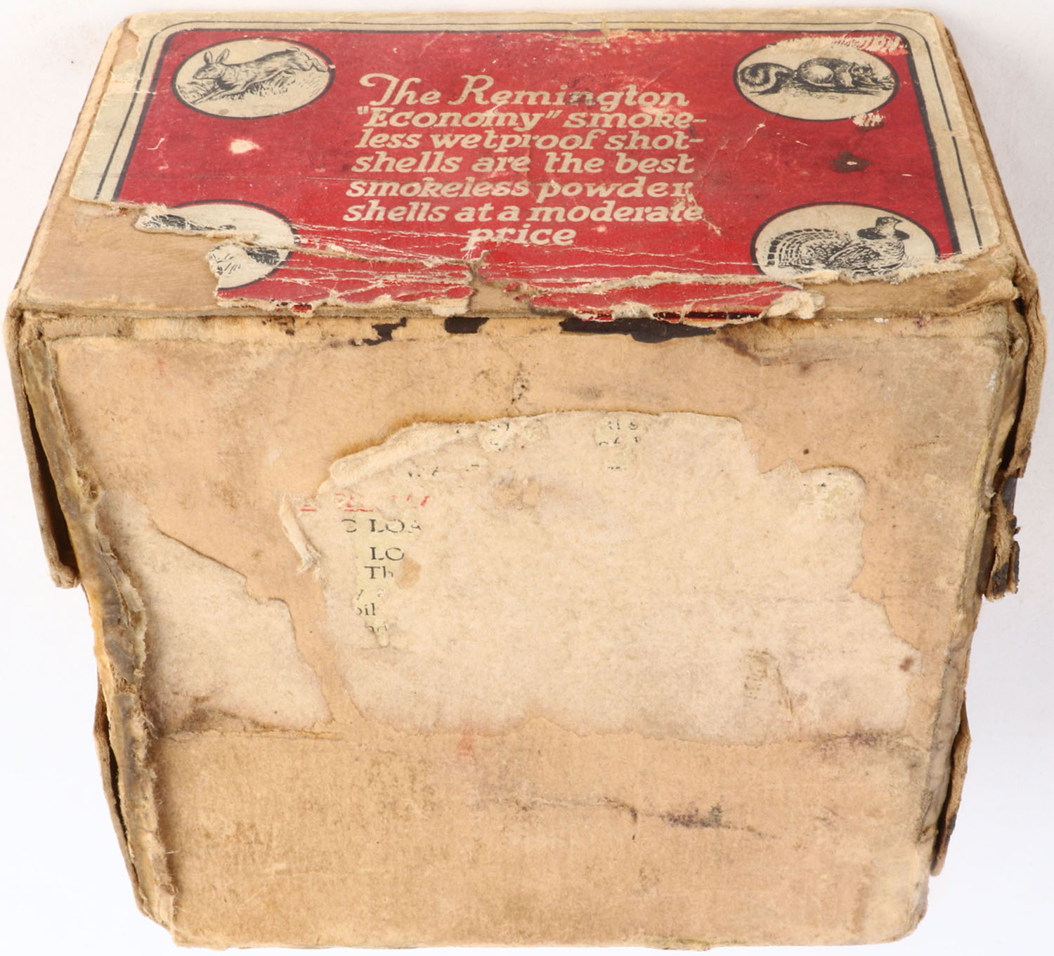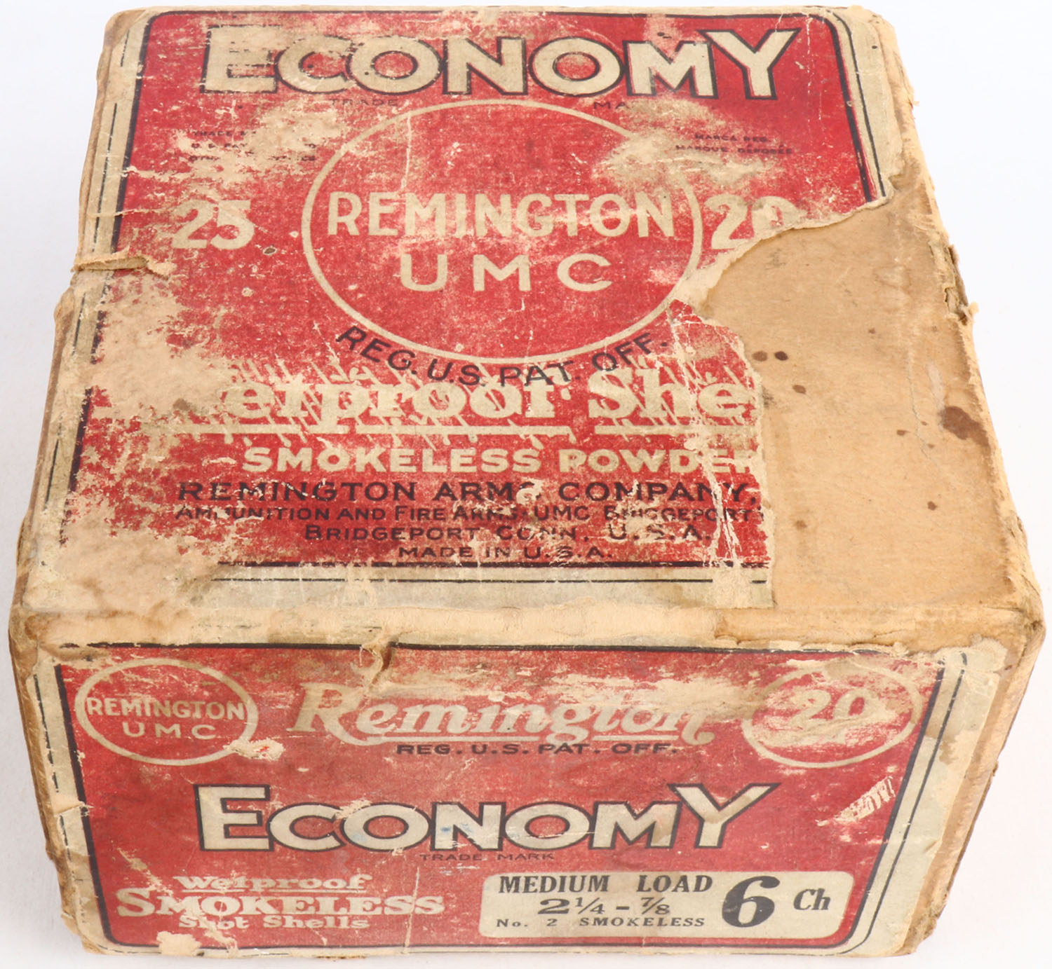 Remington UMC, Economy, 20ga., 2pc., Empty, shot size 6 CH Medium Load, buff box with red & white label, box has nice label that is 65% intact, box has edge wear, soiling, scuffing & seam splits. Grade: Very Good + - Value: 20 to 100