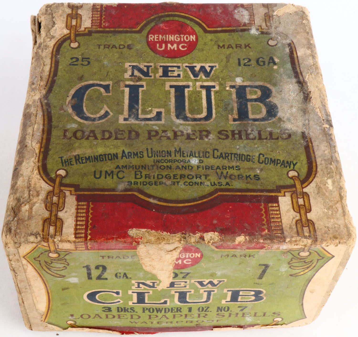 REM UMC, New Club, 12ga, 2pc., Empty, shot size 7, buff box with green, blue & red paper label, label is 85% intact, box has edge wear, scuffing & soiling with nice color to label. Grade: Very Good + - Value: 10 to 60