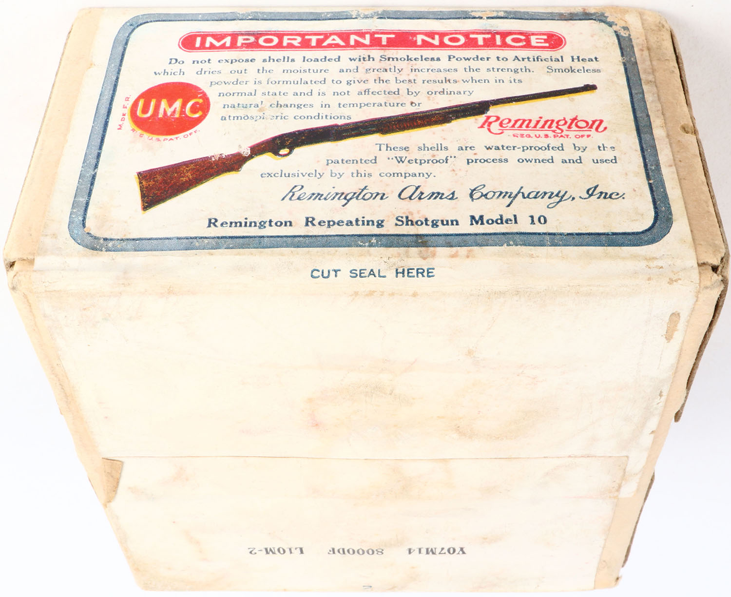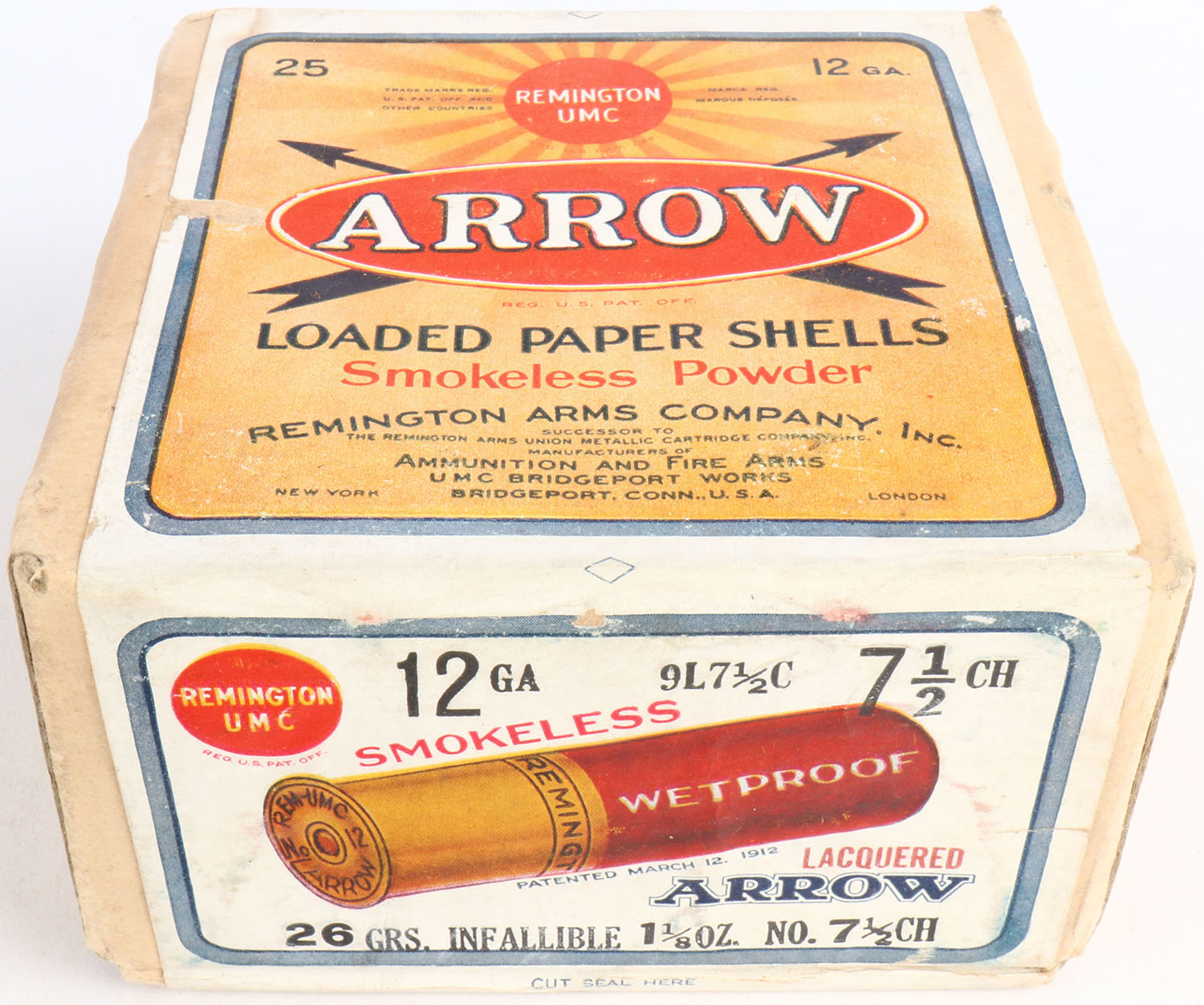 REM-UMC, ARROW, 12ga., 2pc., FULL & SEALED, shot size 7 1/2 CH, buff box with sunburst logo & multi-colored label, box has light soiling with great colors. Grade: Excellent + - Value: 100 to 300