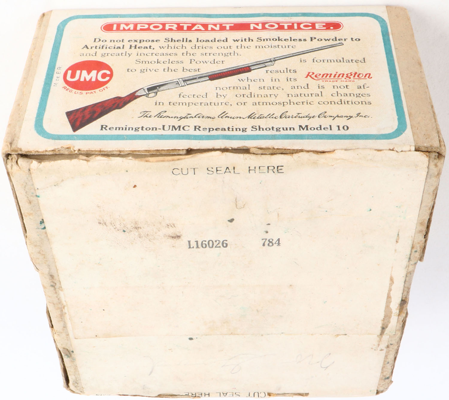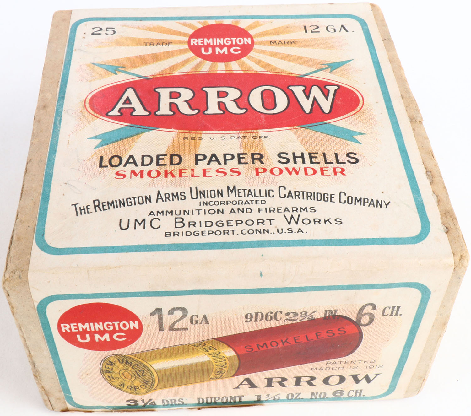 REM-UMC, ARROW, 12ga., 2pc., Empty, shot size 6 CH, buff box with sunburst logo & multi-colored label, box has light edge wear with great colors. Grade: Excellent + - Value: 50 to 150