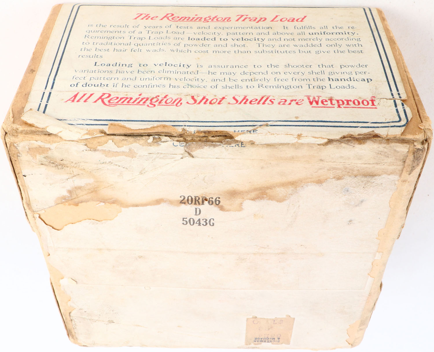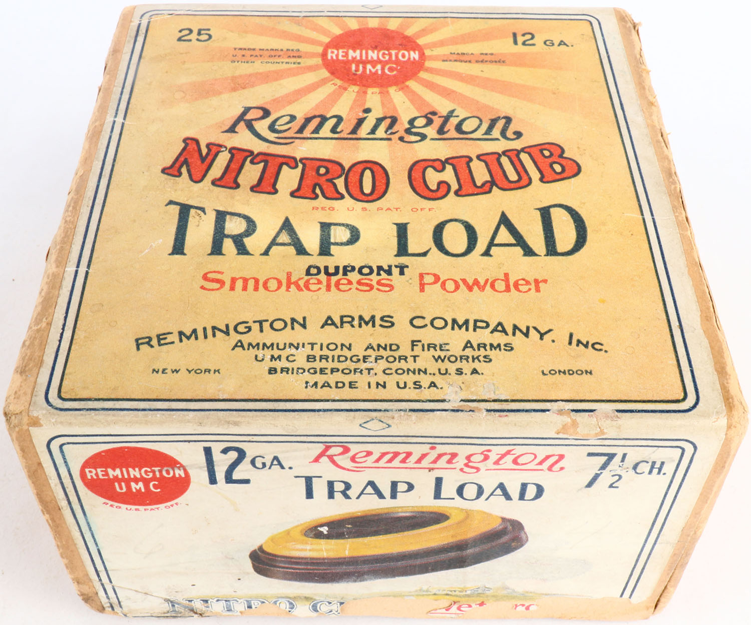 RARE Remington Nitro Club, TRAP LOAD, 12ga., 2pc., Empty, shot size 7 1/2 CH, buff box with sunburst logo & Clay Bird in flight on side, box has seam split, light edge wear & light soiling. Hard to find box. Grade: Excellent - Value: 100 to 500