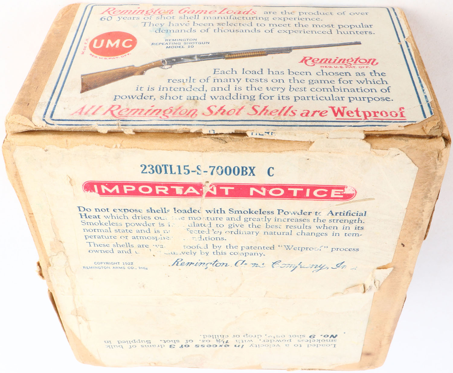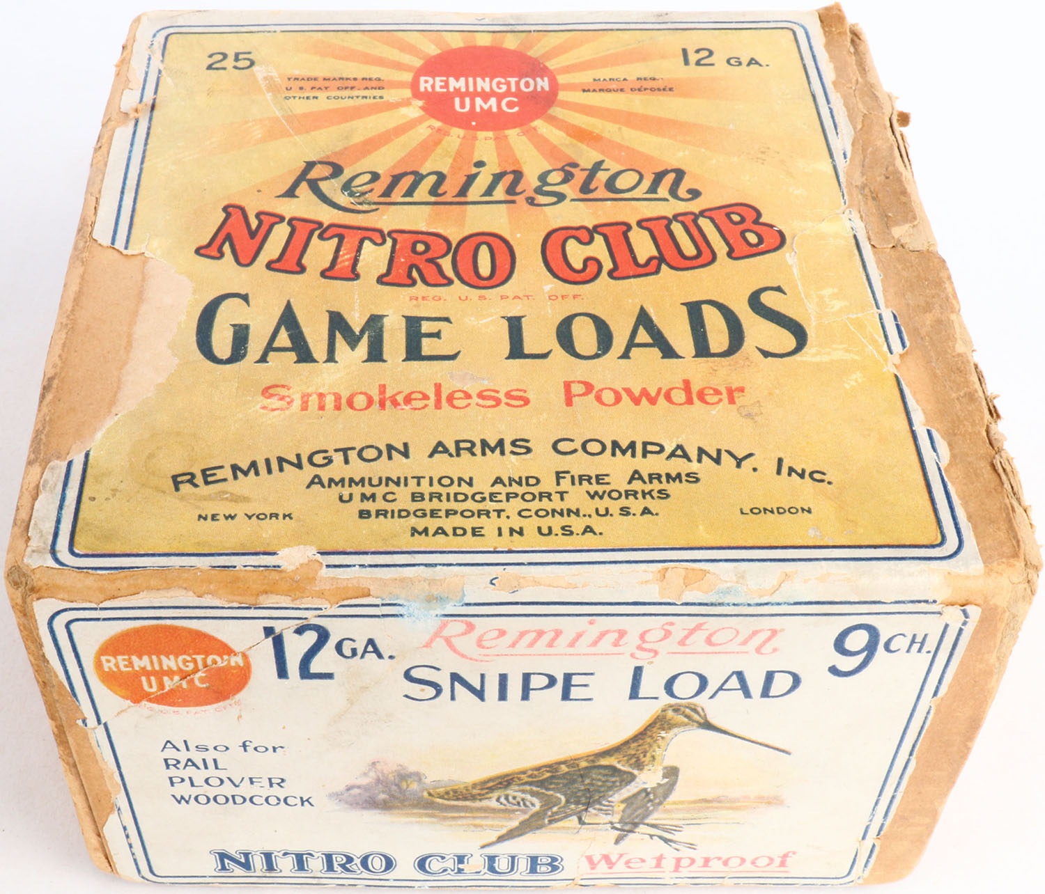 Remington UMC Nitro Clubs, GAME LOADS, SNIPE LOAD, 12ga., 2pc., FULL, shot size 9 CH, buff box with sunburst logo & SNIPE on side, box has tape repair, small shell protrusions, seam split, light edge wear & light scuffing, label is excellent with great color, shells are excellent. Grade: Excellent - Value: 200 to 800