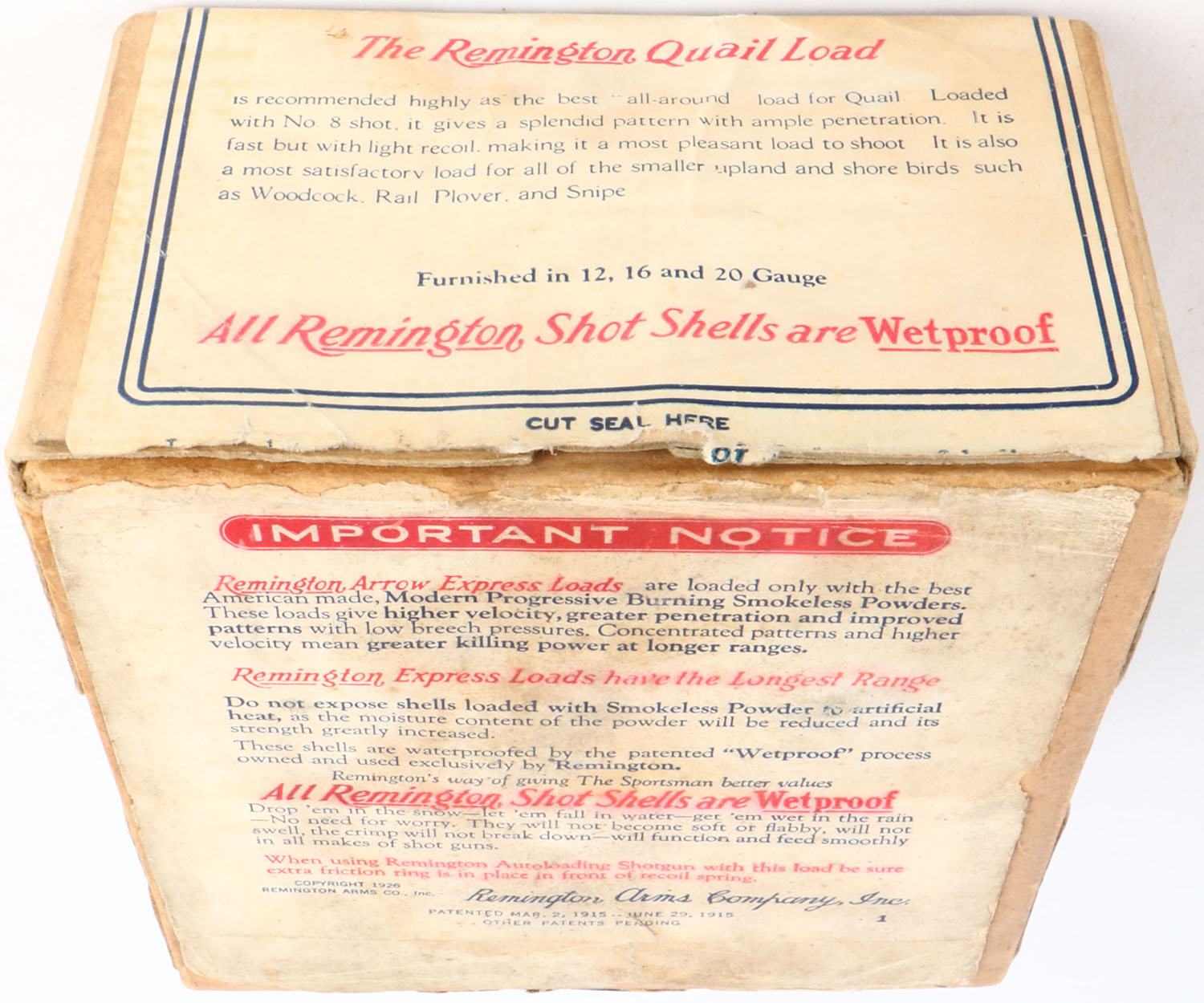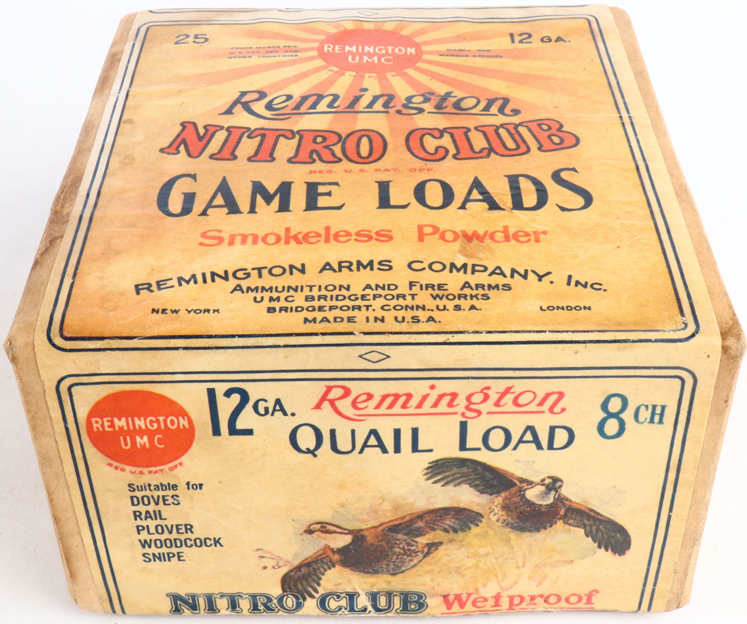 Remington UMC Nitro Club, GAME LOADS, QUAIL LOAD, 12ga., 2pc., Empty, shot size 8 CH, buff box with sunburst logo & QUAIL in flight on side, box has soiling with nice label. Grade: Very Good ++ - Value: 50 to 200