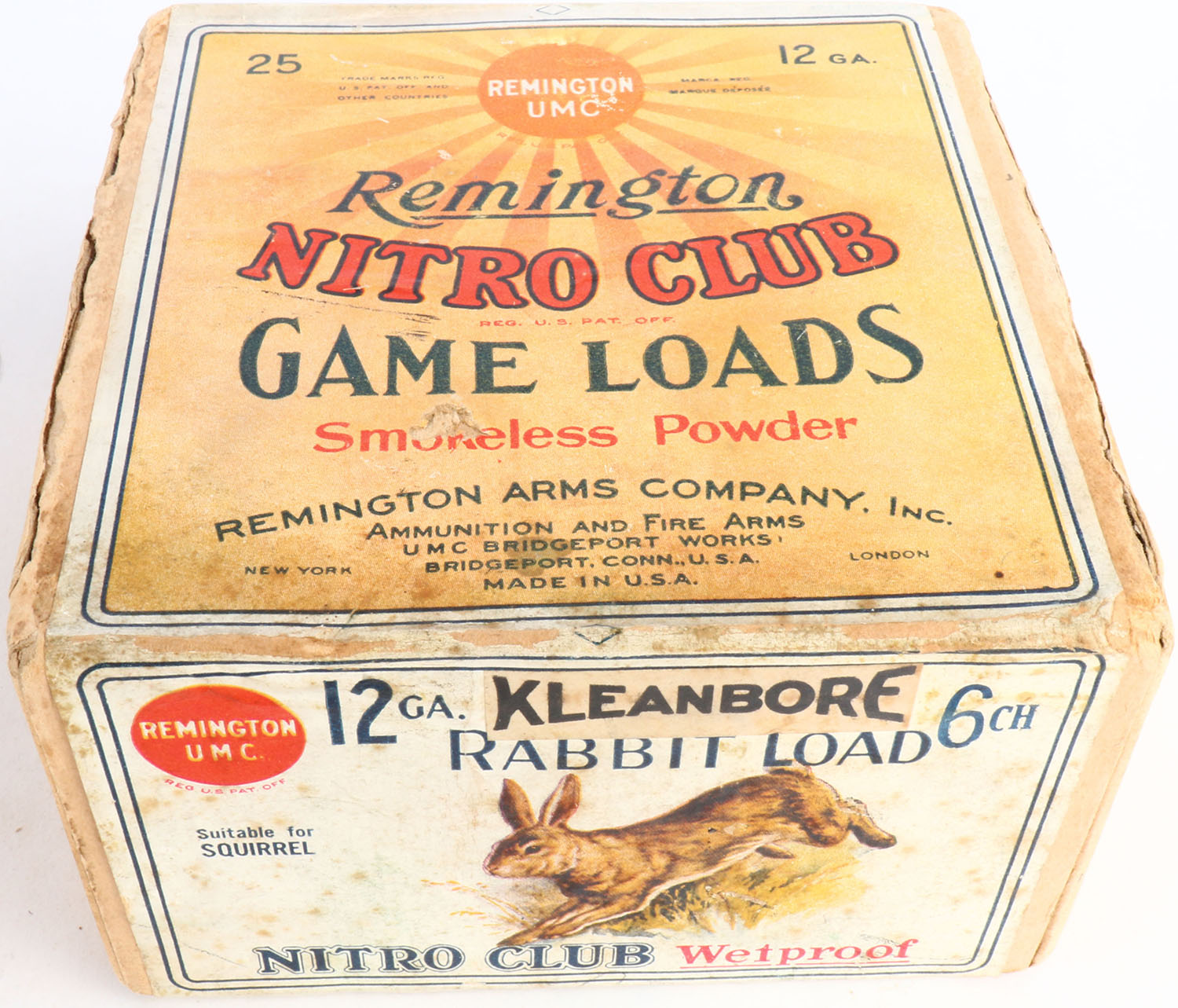 Remington UMC Nitro Club, GAME LOADS, RABBIT LOAD, 12ga., 2pc., FULL & SEALED, shot size 6 CH, buff box with sunburst logo & RABBIT on side, box has light soiling, light scuffing & seam splits with great label. Grade: Excellent - Value: 100 to 400