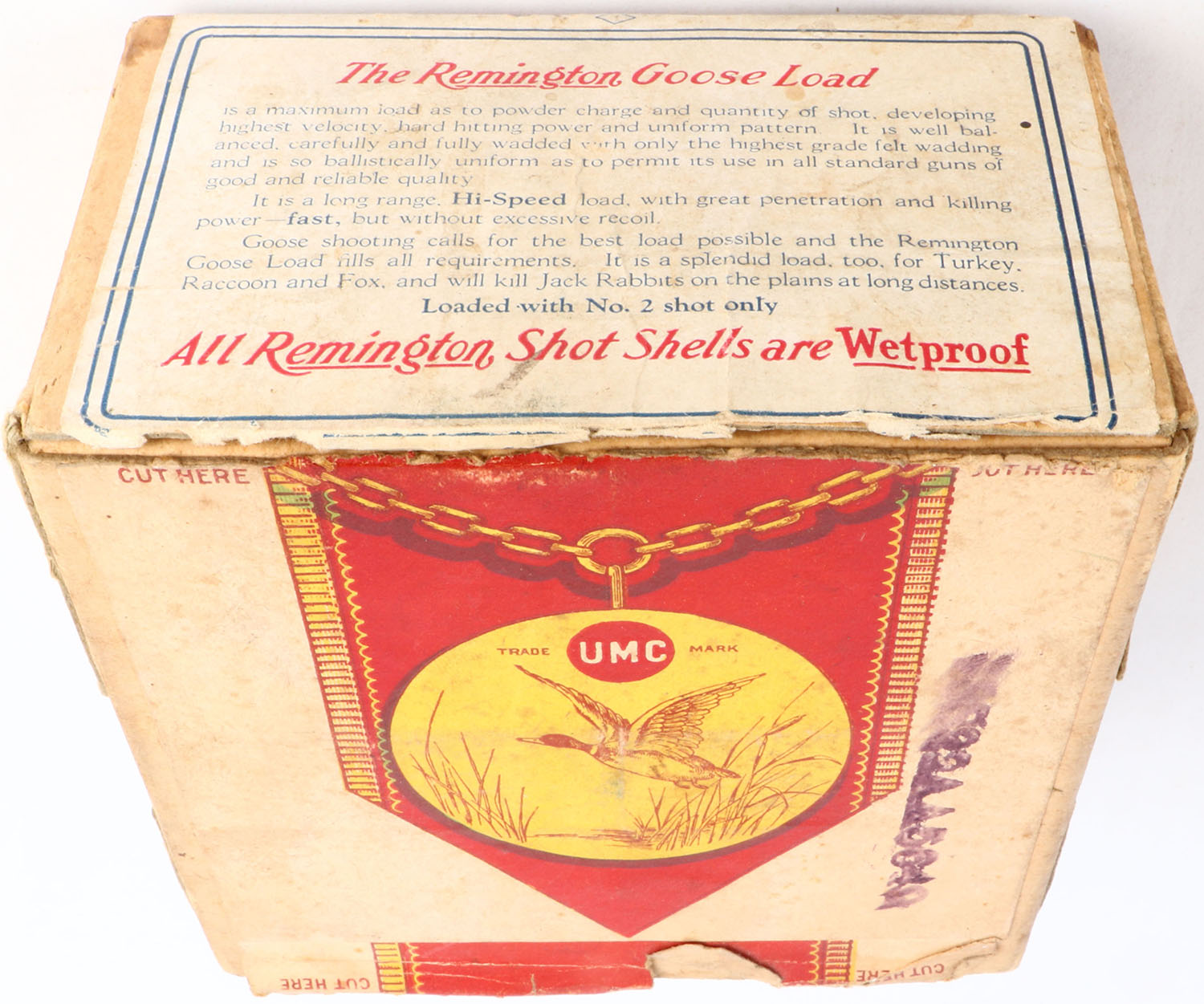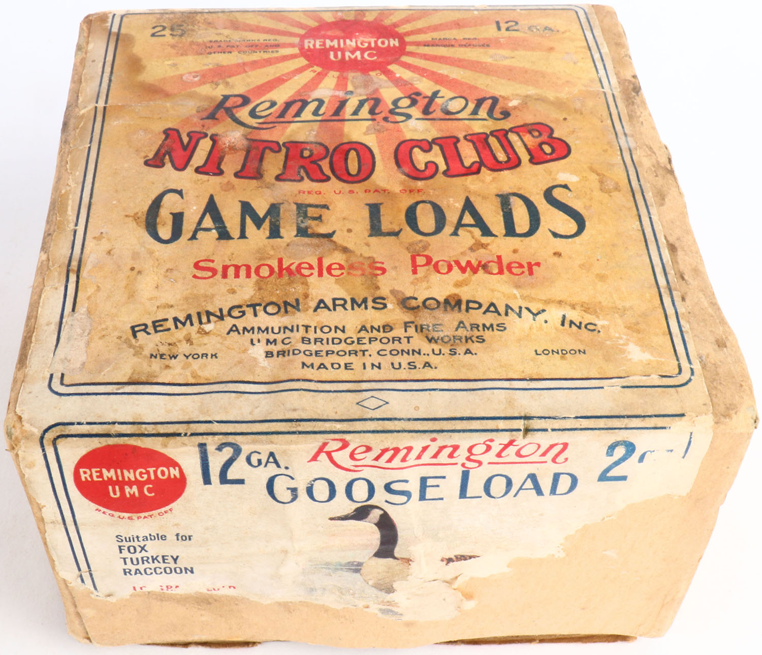 Remington UMC Nitro Club, GAME LOADS, GOOSE LOAD, 12ga., 2pc., Empty, shot size 2 CH, buff box with sunburst logo & GOOSE on side, box has soiling, scuffing & incorrect bottom. Grade: Very Good + - Value: 30 to 200