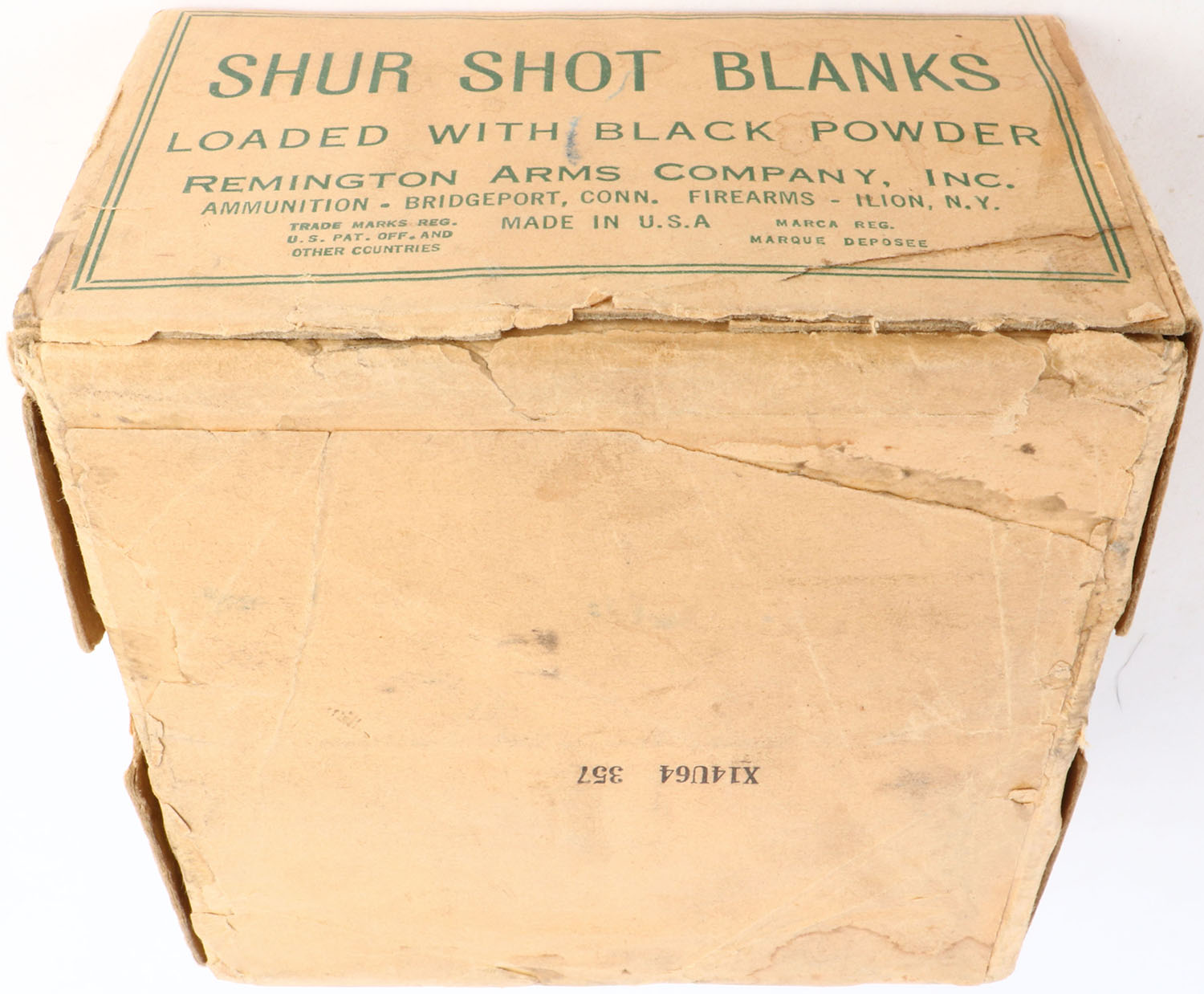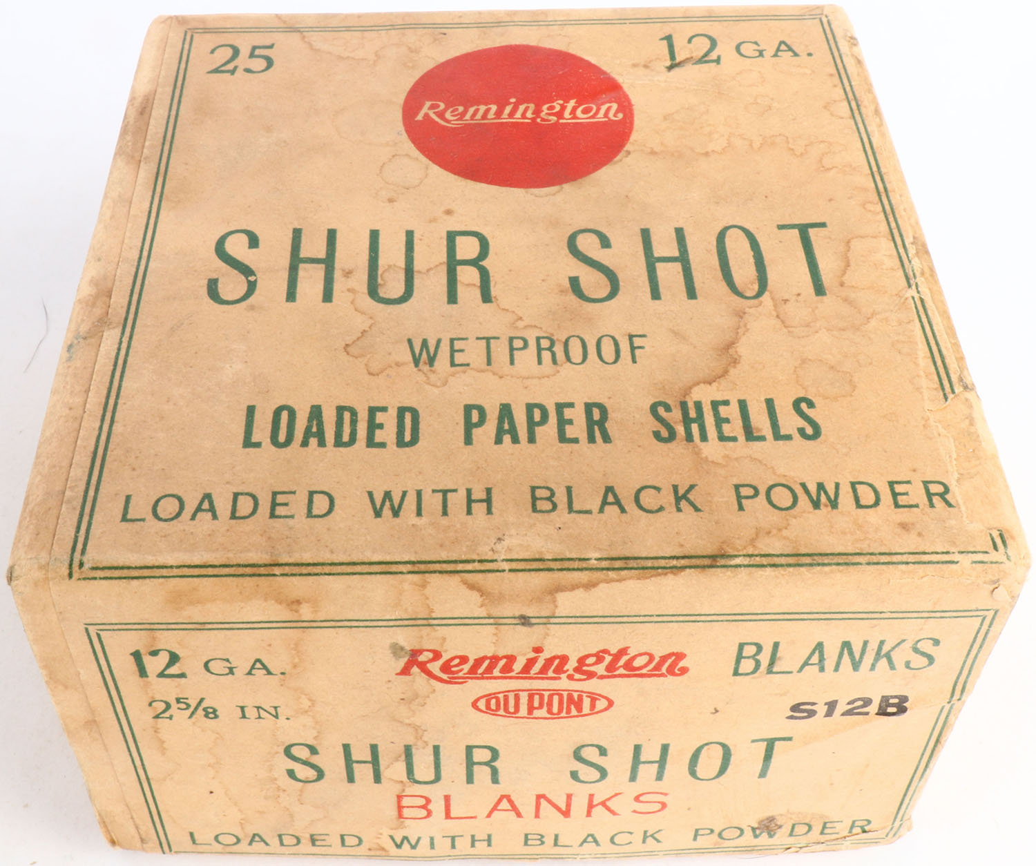 Remington, SHUR SHOT, 12ga., 2 5/8'', 2pc., Full, shot size Black Powder Blanks, Buff box with buff, green & red paper label, box is solid with light soiling & light edge wear with great colors, Shells are excellent. Grade: Excellent - Value: 50 to 200