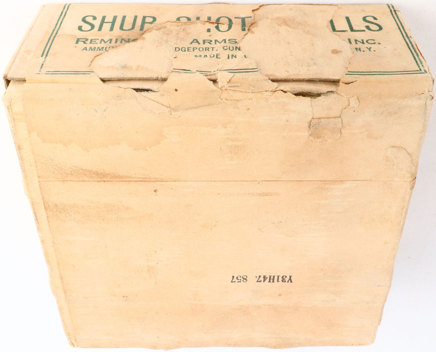 Remington, SHUR SHOT, 12ga., 2'', 2pc., FULL & SEALED, shot size 7 1/2 C, Buff box with buff, green & red paper label, label is 85% intact, box is solid with soiling & very nice colors. Grade: Excellent - Value: 80 to 300