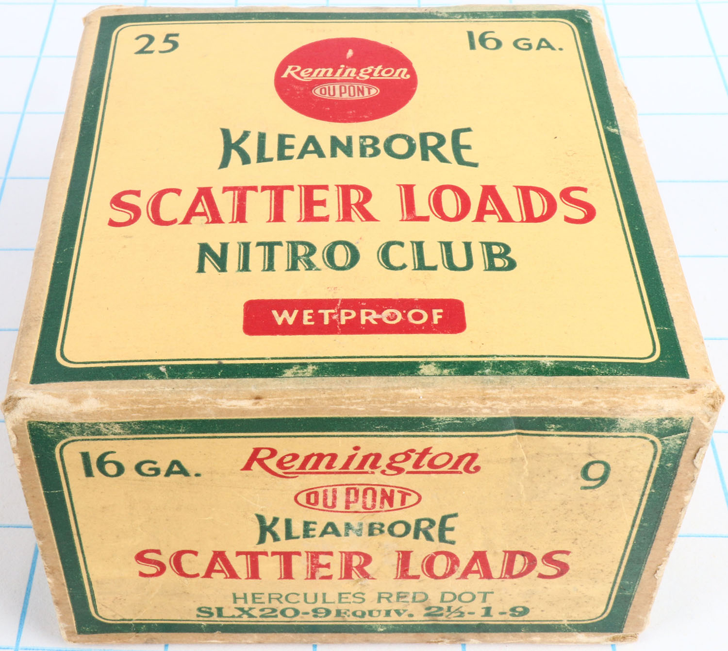 Remington Kleanbore, NITRO CLUB Scatter Loads, with insert, 16ga., 2 1/2'', 1pc., Partial 22rds., shot size 9, box is yellow, red and green, box has light edge wear, glue repair & light scuffing with very nice colors, shells are excellent. Grade: Excellent - Value: 20 to 60