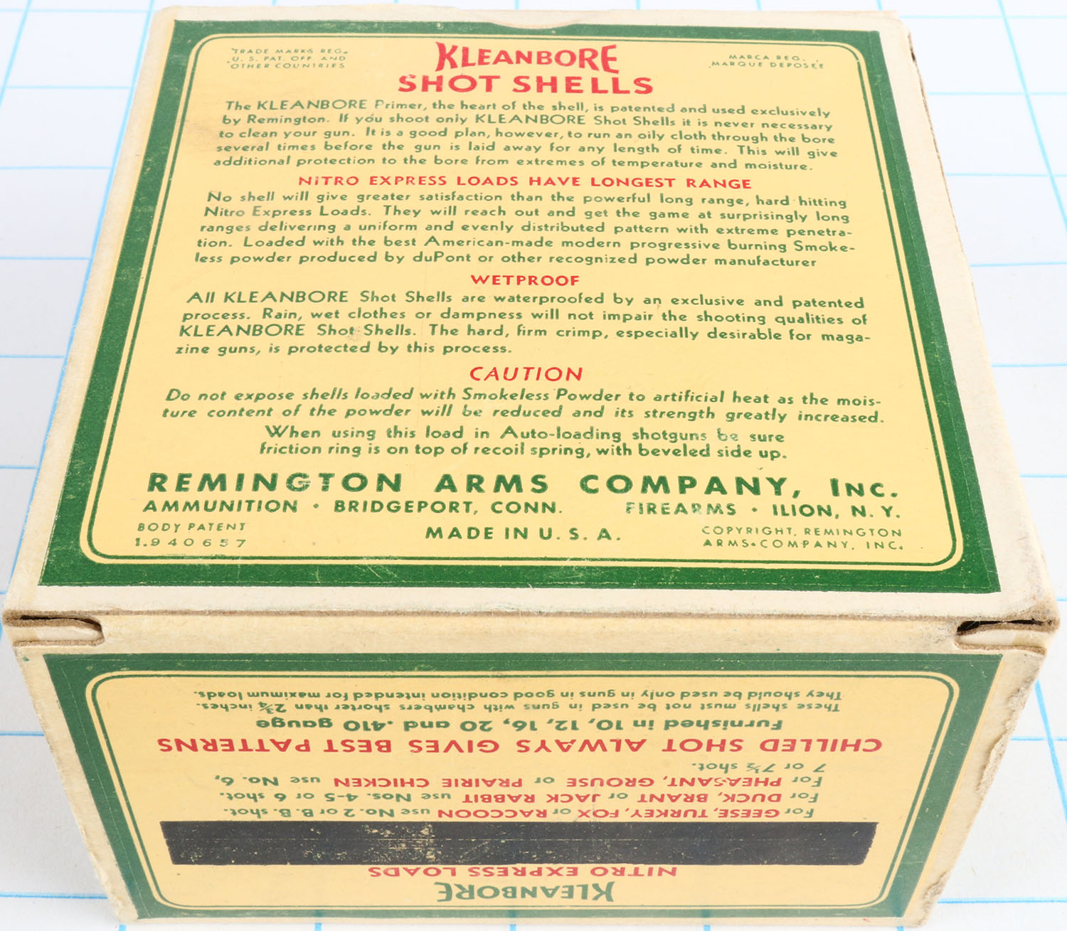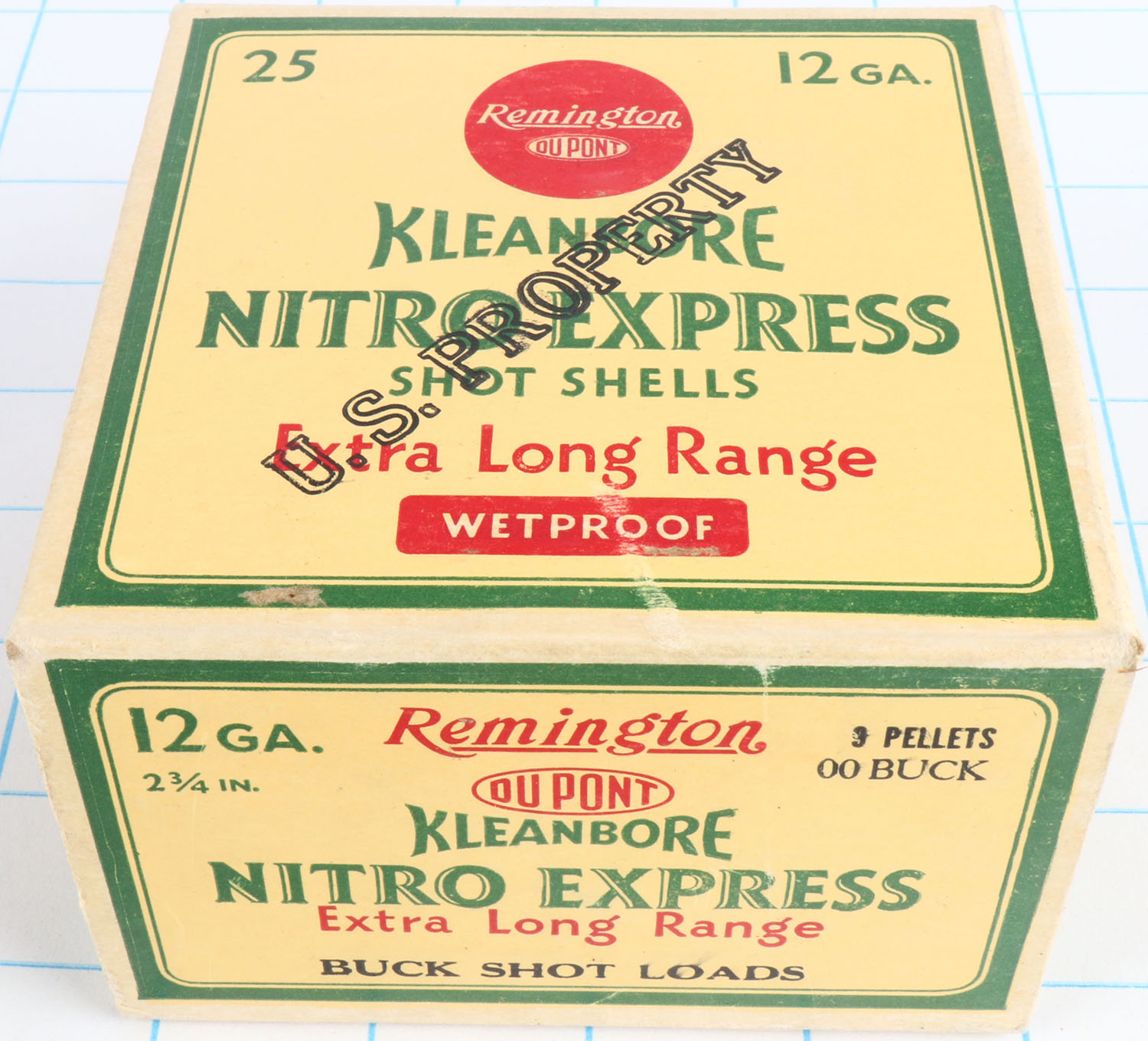 Remington Kleanbore, US PROPERTY, NITRO EXPRESS, 1pc., Full, shot size 00 BUCK Shot Loads, box is yellow, red and green, box is very solid with great colors, shells are excellent. Grade: Excellent ++ - Value: 20 to 60